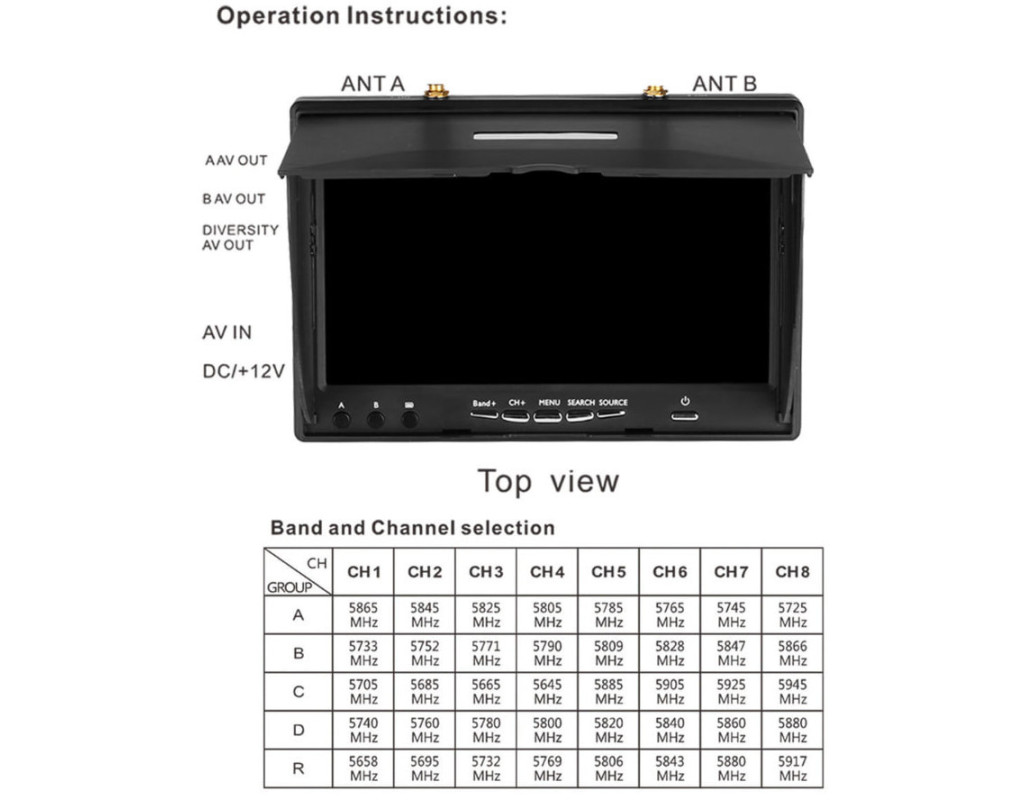 | ХАРАКТЕРИСТИКИ: Модель: LCD5802D Размер экрана: 7' Разрешающая способность: 800х480 Яркость: 600cd/m2 Угол обзора: 140/120 градусов Частота: 5.6-5.9GHz Количество каналов: 40CH Аккумулятор: 2000mAH/7.4V Чувствительность: -90dBm Тип антенн: RPSMA male Рабочее напряжение: DC 7~16V Энергопотребление: Max 650mA @ 12V Ток зарядки аккумулятора: 850mA @12V Max Размеры: 180x120x50 мм 1x Монитор Foxeer LCD5802D DVR 5.8GHz 40CH 2х 5.8GHz Антенна RPSMA male 2х AV кабель 1х Зарядное устройство |