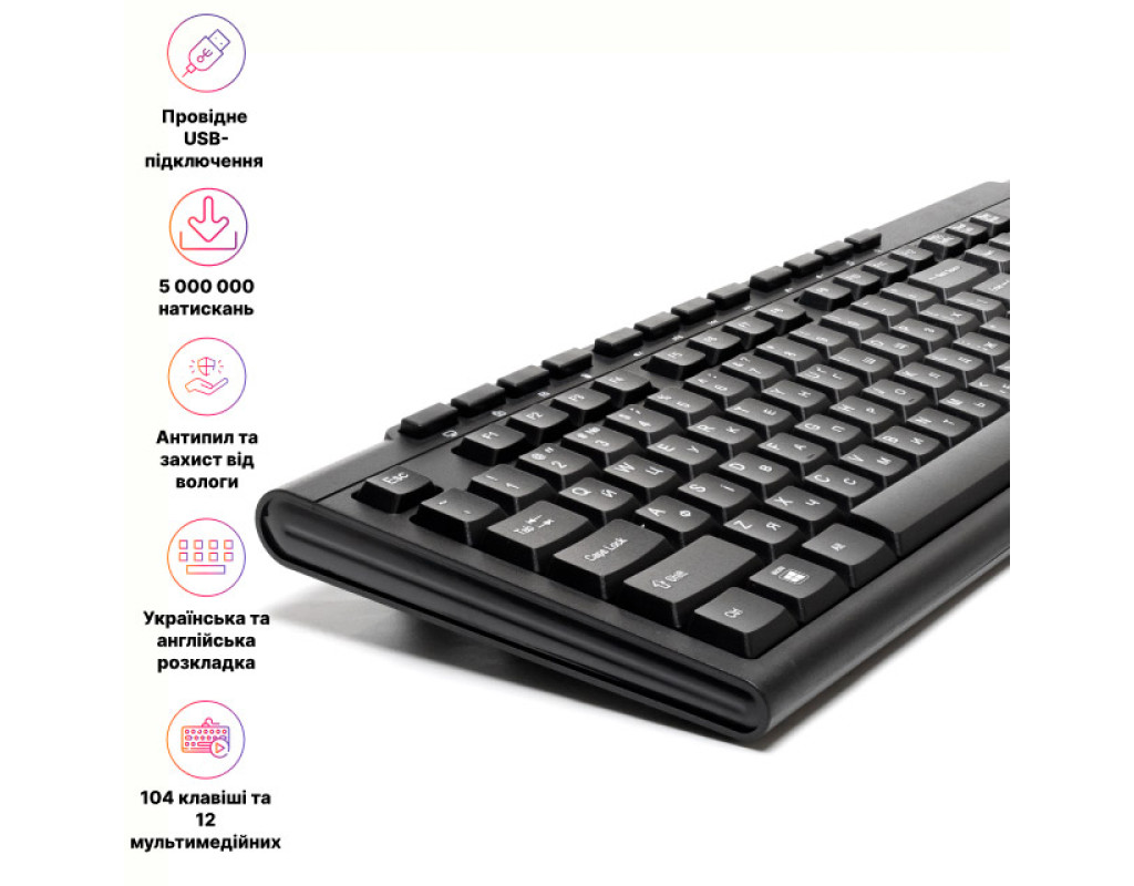 | Клавиатура Hölmer K-01OF USB UA Black (K-01OF) — это полноразмерная мультимедийная клавиатура для тех, кто ценит стабильность и функциональность. Этот надежный инструмент отличается классическим дизайном, который гармонично сочетает в себе практичность и современные технологии. Она идеально подходит для работы и развлечений благодаря широкому набору возможностей. Основные преимущества Hölmer K-01OF включают 12 дополнительных мультимедийных клавиш, которые обеспечивают быстрый доступ к функциям регулировки громкости, управления воспроизведением мультимедиа, а также мгновенный переход к браузеру или электронной почте. Эти функции повышают производительность, позволяя пользователям меньше отвлекаться на мышь. Стабильность подключения гарантируется благодаря проводному USB-интерфейсу, который обеспечивает моментальную реакцию клавиатуры без задержек. Длина кабеля в 1.4 метра позволяет удобно организовать рабочее пространство. Поддержка технологии Plug & Play позволяет начать работу сразу после подключения без лишних настроек. Долговечность модели Hölmer K-01OF обеспечивается мембранным механизмом клавиш, рассчитанным на 5 000 000 нажатий. Клавиатура имеет антипылевую конструкцию и базовую защиту от проливания, что делает её надежной в использовании даже в случае случайных неприятностей. Удобство и комфорт — ключевые качества полноразмерного формата этой клавиатуры. 104 основные клавиши с англо-украинской раскладкой обеспечивают легкий набор текста и работу с числовыми данными. Клавиатура совместима с ОС Windows, что делает её универсальным решением для любого ПК. |
