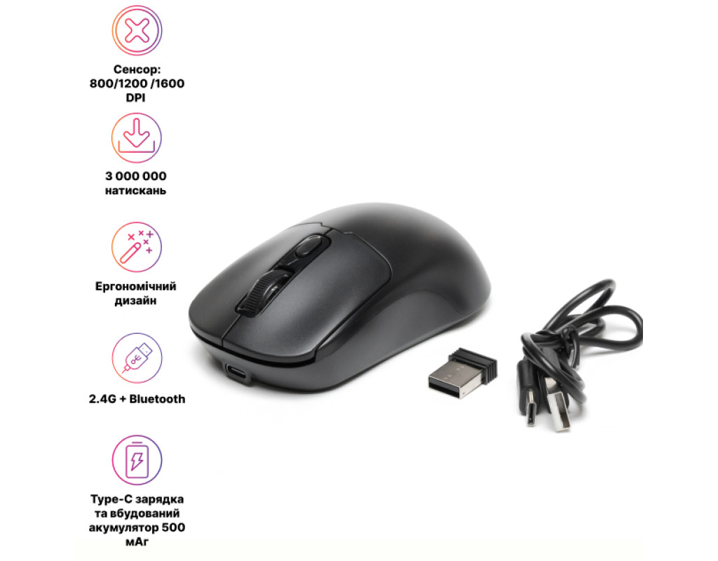 Мышь оснащена встроенным литиевым аккумулятором на 500 мА*ч, который устраняет необходимость покупать сменные батарейки. Зарядка осуществляется через универсальный порт USB Type-C, что делает процесс быстрым и удобным. Специальные бесшумные переключатели минимизируют звук щелчка. Это идеальное решение для тихих библиотек, совместных рабочих пространств (коворкингов) или ночной работы дома, где важна полная концентрация. Оптический сенсор МX8650 позволяет быстро настраивать чувствительность под конкретную задачу, выбирая между 800, 1200 или 1600 DPI. Четыре функциональные кнопки повышают вашу эффективность при работе. Классический черный цвет MW-03OF органично впишется в любой интерьер. Мышь совместима практически со всеми современными платформами: Windows 8/10/11, Mac OS, Android и даже iOS 13+. |
