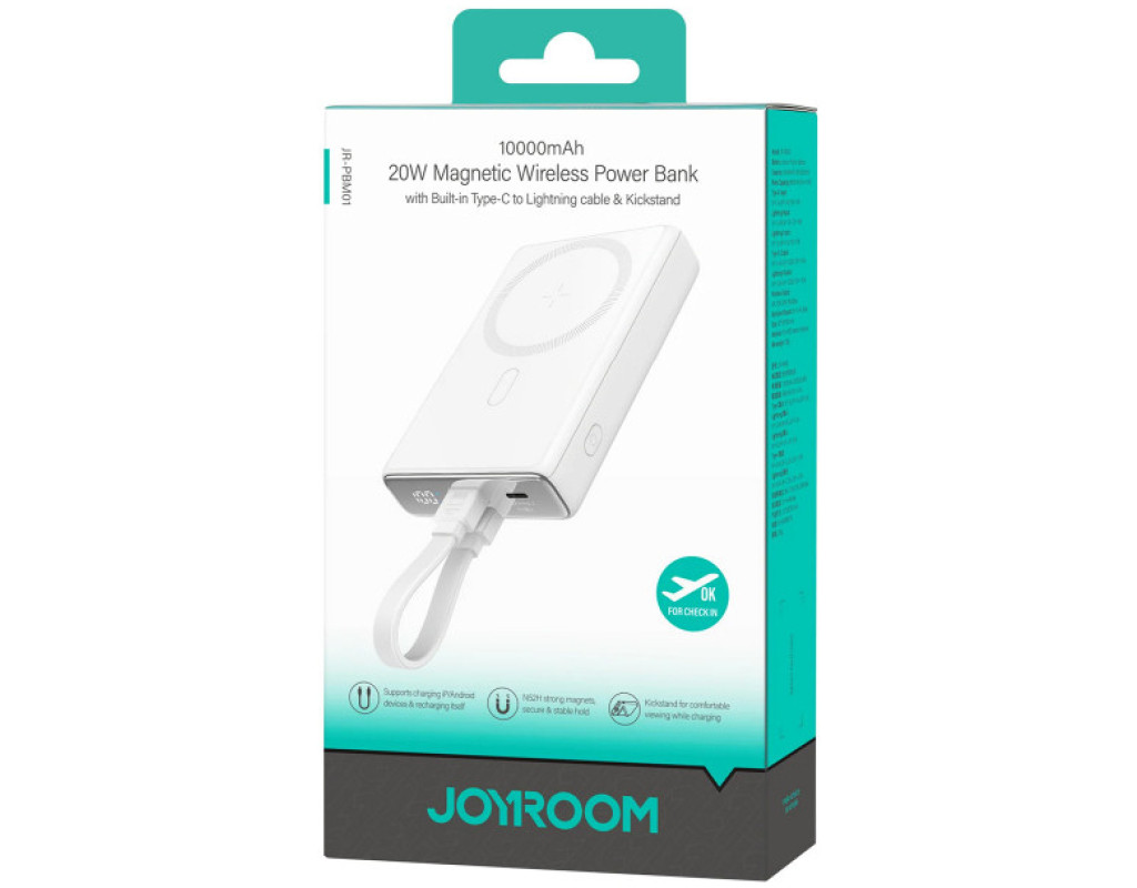 Описание Внешний аккумулятор Joyroom Magnetic JR-PBM01 10000mAh 20W White (6941237112545) Магнитное зарядное устройство для Joyroom JR-PBM01 гарантирует, что ваш телефон или беспроводные наушники останутся заряженными, когда вам больше всего нужно. Благодаря максимальной выходной мощности 20 Вт и поддержке технологии Power Delivery этот павербанк обеспечивает быструю зарядку, позволяющую восстанавливать энергию в три раза быстрее стандартных павербанков. Складная подставка и съемный кабель обеспечивают комфортное использование в любых условиях. Интеллектуальная система контроля температуры обеспечивает безопасность устройства и пользователя. Важнейшие преимущества павербанка Joyroom JR-PBM01: