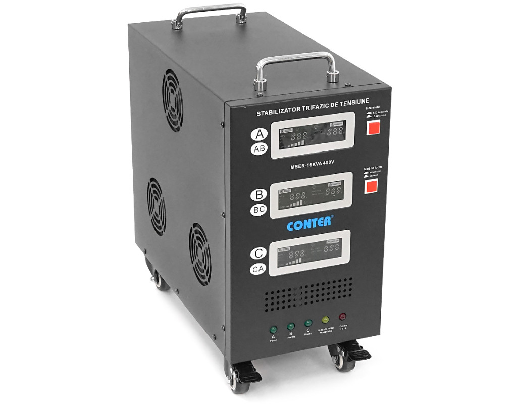 Стабілізатор напруги Conter MSER-15KVA / 12KW- 400V-V2 трифазний, сервопривід, монтажу підлоги, LED дисплей, діапазон 225-450V, AC400±3%, колодка, 416x219x352 mm, 33.8kg