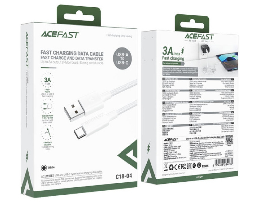 Дата кабель USB 2.0 AM to USB-C 1.2m 3A white Acefast (6974316284260)