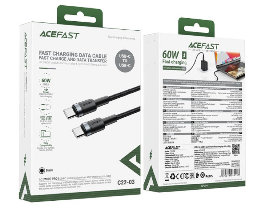 Acefast C22-03 USB 2.0 Type-C M-M - надійний кабель для пристроїв із роз’ємом USB-C, зокрема ноутбуків, планшетів та смартфонів. Він забезпечує стабільне заряджання з потужністю до 60 Вт (20В/3А). Кабель Acefast C22-03 USB 2.0 Type-C M-M оснащений стійкими до механічних пошкоджень та окислення конекторами з високоякісного алюмінієвого сплаву. Зовнішнє міцне нейлонове обплетення захищає кабель від розривів, перегинів та заплутування. |
