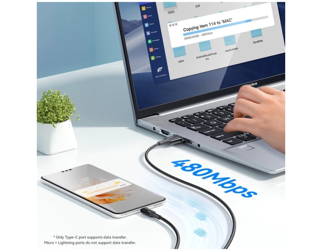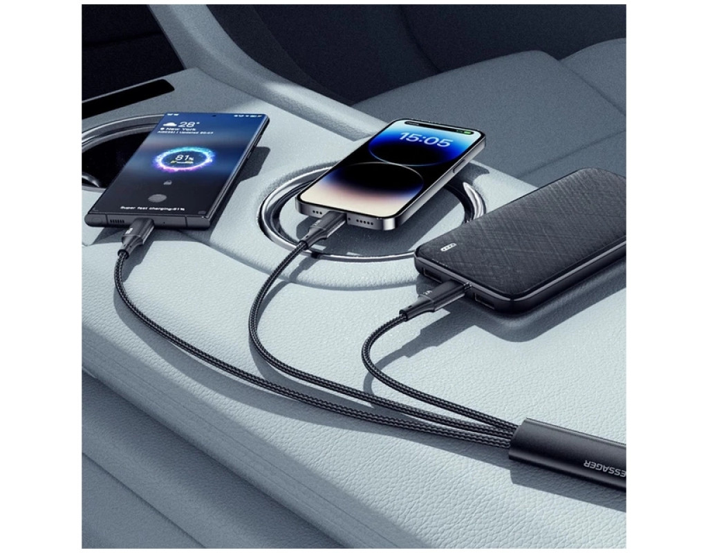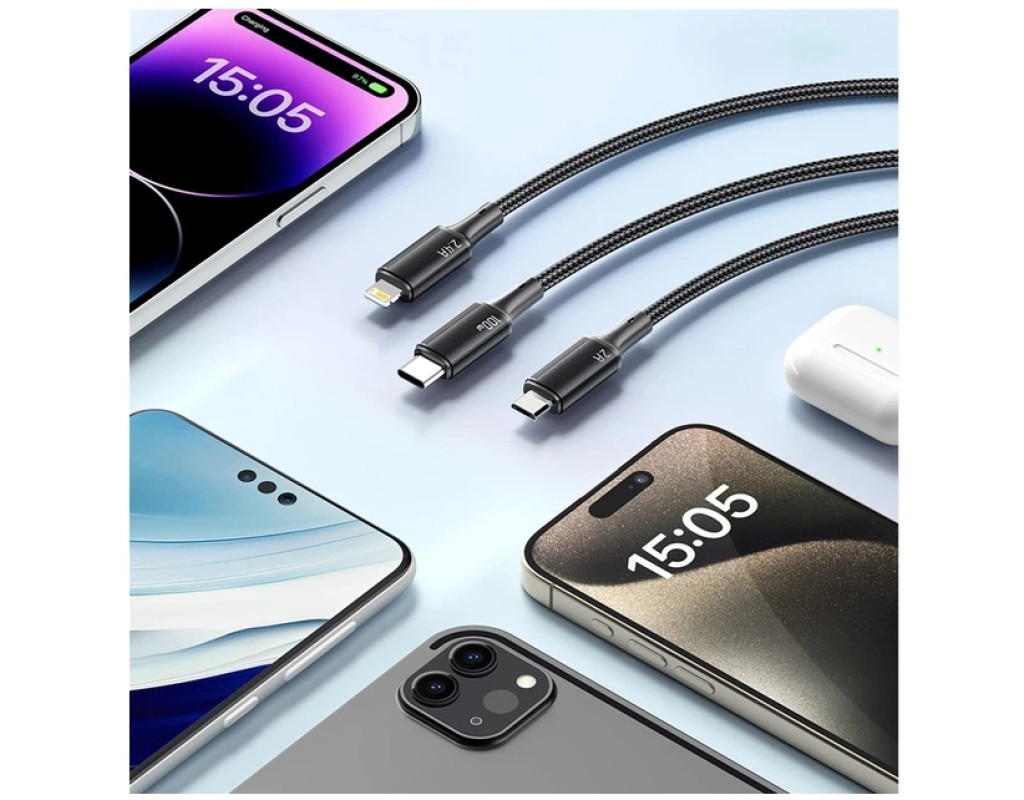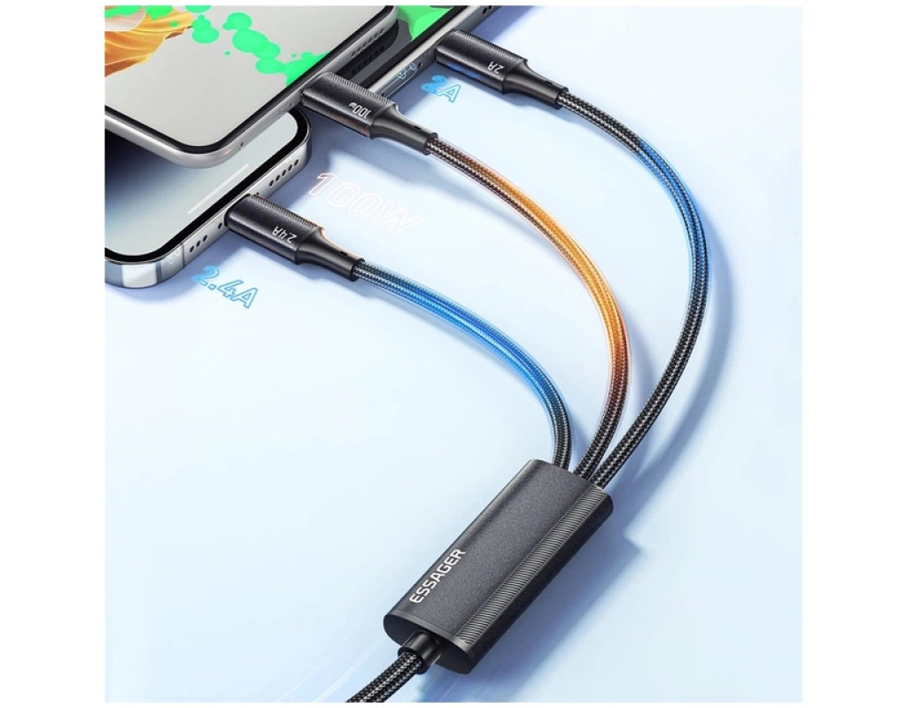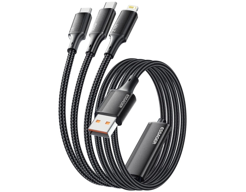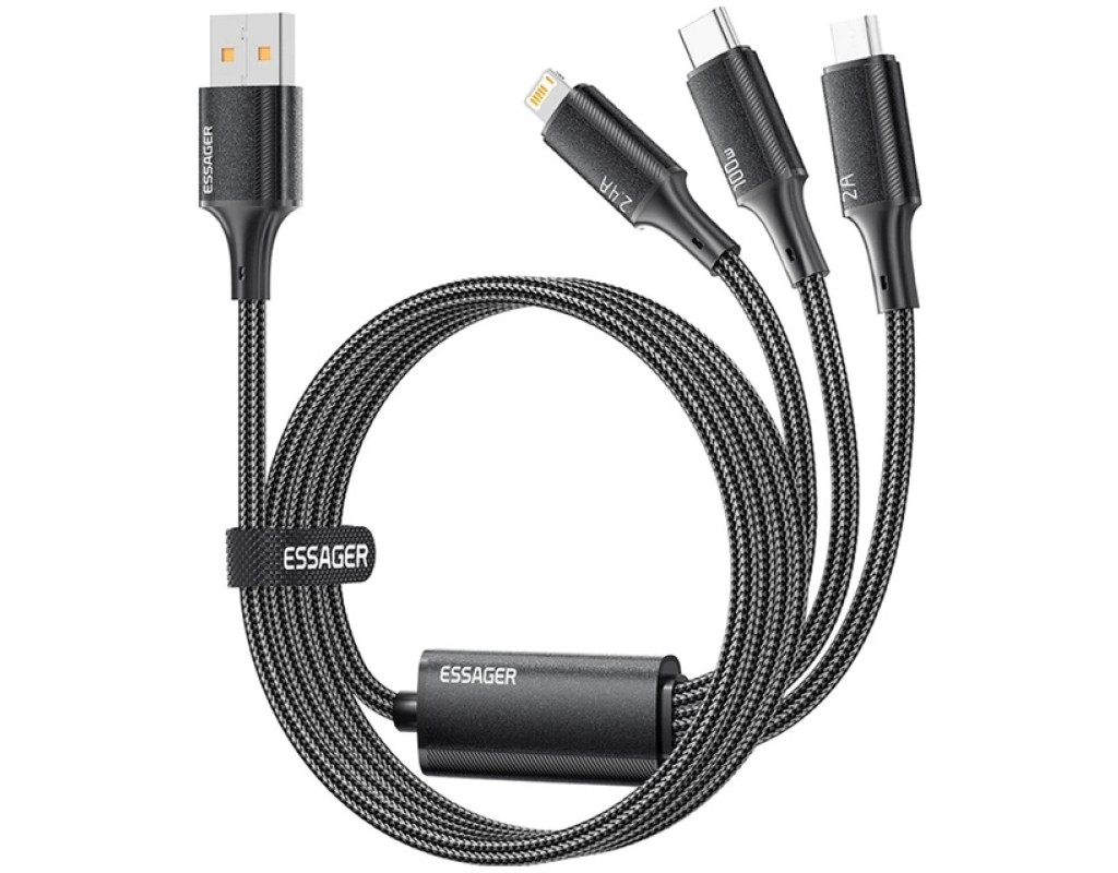 | Essager Simple 3 in 1 USB кабель обеспечивает быструю зарядку мощностью до 100W, что делает его идеальным для быстрой зарядки различных устройств. Кабель длиной 1.2 метра имеет три разъема: USB Type-A для USB Type-C, Lightning и Micro USB, что обеспечивает совместимость с широким спектром гаджетов. Благодаря крепкой конструкции из алюминиевого сплава и прочного оплетения, кабель обеспечивает долговечность и надежность. Кроме того, кабель поддерживает скорость передачи данных до 480 Мбит/с. Кабель Essager 3 в 1 отличается широкой совместимостью. С его помощью можно заряжать смартфоны iPhone, Xiaomi, Huawei, Samsung и OPPO, планшеты, внешние аккумуляторы и настольные вентиляторы. Кабель Essager 3 in 1 позволяет не только быстро, но и безопасно заряжать. Он оснащен смарт-чипом, благодаря которому автоматически подстраивает работу под требования подключенного устройства, предохраняя его от повреждений. Продукт также защищен от перегрева и низких температур. Выходы: