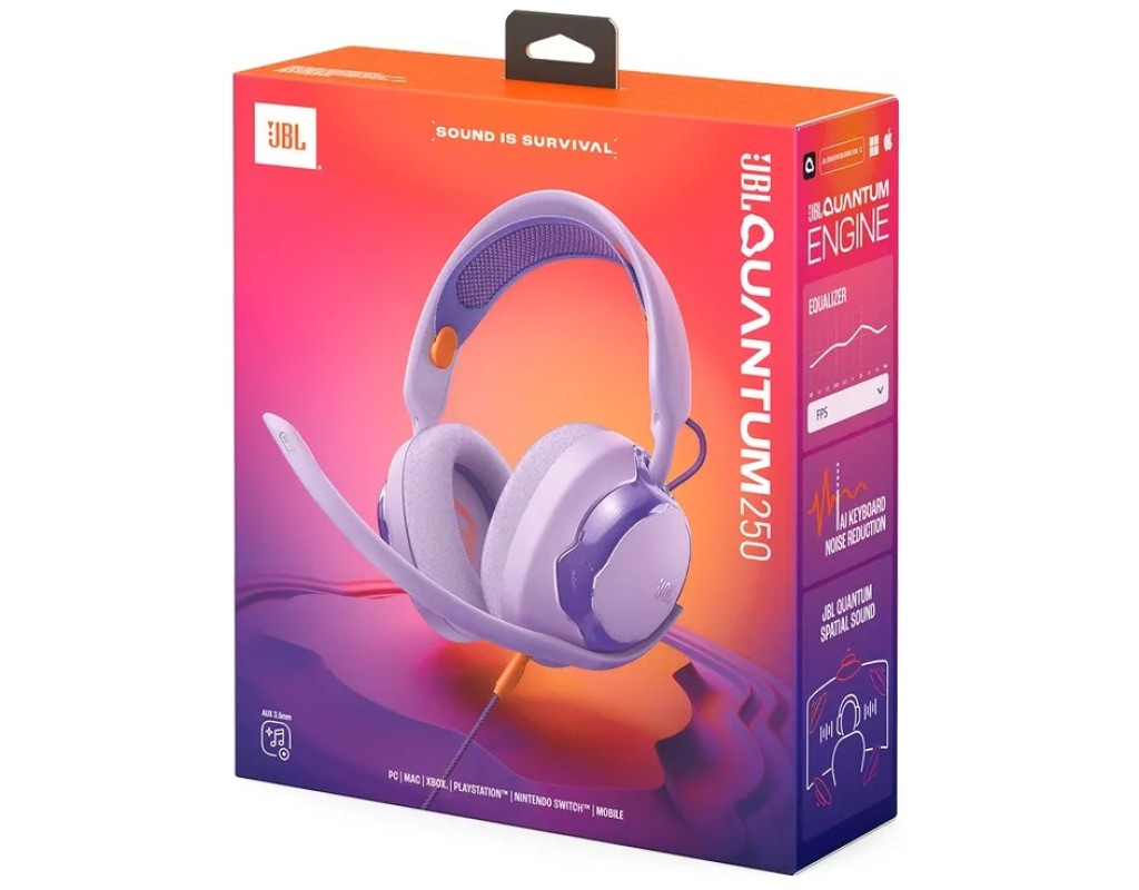 Повышай уровень игры с насыщенным звучанием гарнитуры JBL Quantum 250. JBL Quantum Spatial Sound обеспечивает улучшенное пространственное восприятие и точность аудио. Оснащенная 50мм карбоновыми динамическими драйверами, гарнитура JBL Quantum 250 переносит тебя в самый центр событий, предпочитая необходимое для максимальной производительности. Слышь каждый звук, который издают твои соперники, вне зависимости от их расположения в твоем звуковом поле. Благодаря 6-мм кардиоидному микрофону-буму твоя команда всегда услышит твои команды громко и четко. Оба элемента оптимизированы технологией JBL QuantumENGINE, предлагающей настройки аудио, ориентированные на геймеров. И все это – с безупречным подключением к любой игровой платформе через аудиокабель 3.5 мм. Лучше всего то, что кабель, микрофон, ультралегкий гамак и мягкие амбушюры легко заменяются, поэтому эта гарнитура станет твоим любимым аксессуаром на долгие годы. Особенности и преимущества 50мм карбоновые динамические драйверы для насыщенного JBL Quantum Sound Наши 50мм динамические драйверы созданы с использованием уникального карбонового демпфирующего материала для лучшей производительности и минимальных искажений. Это обеспечивает погружение в реалистичный аудио опыт, необходимый для самых интенсивных игровых сессий. JBL QuantumENGINE Используй панель управления JBL QuantumENGINE, адаптированную под твое устройство, чтобы настроить желаемый звуковой профиль, определить источник звуков в игре с помощью визуализатора в реальном времени, уменьшить шум клавиатуры, добавить голосовые эффекты, оптимизировать работу микрофона и шумоподавления. Работает на всех платформах и поддерживает одновременное подключение всех гарнитур JBL Quantum. JBL Quantum Spatial Sound Аудио нового поколения JBL Quantum Spatial Sound обеспечивает более естественный, чёткий и погружной звук. Обрабатывая больше аудиодеталей из твоего игрового контента, система генерирует эхо и реверберацию. Благодаря разным параметрам на разных частотах она создает максимально реалистичное игровое пространство. Кардиоидный микрофон-бум с шумоподавлением Новый 6мм однонаправленный микрофон с кардиоидной диаграммой направленности гарантирует, что твоя команда всегда услышит тебя четко и громко, но не услышит щелчок клавиатуры благодаря технологии шумоподавления JBL QuantumENGINE. Микрофон также съемный для дополнительного удобства. Ультралегкий удобный дизайн Высококачественный ультралегкий сетчатый гамак под мягким оголовьем равномерно распределяет вес гарнитуры, обеспечивая комфорт всю ночь. А тканевые амбушюры созданы для полного комфорта во время продолжительных игровых сеансов. Сменные элементы Быстро и легко заменяй не только микрофон и кабель, но и тканевые амбушюры и сетчатый гамак — гарнитура всегда будет выглядеть как новая. Сменные части* обеспечивают долговечность JBL Quantum 250 и делают ее более экологичной. (*запасные части продаются отдельно) Многоплатформенная совместимость Windows, Mac, PlayStation, Xbox, Nintendo Switch – никаких проблем. Гарнитура JBL Quantum 250 работает со всеми платформами через аудиокабель 3.5 мм. Воздействие на окружающую среду JBL стремится создавать более экологичные продукты. Поэтому гарнитура JBL Quantum 250 упакована в бумагу, сертифицированную FSC, напечатанную соевыми чернилами. Пластик частично изготовлен из переработанных материалов, а амбушюры, микрофон, гамак и ка