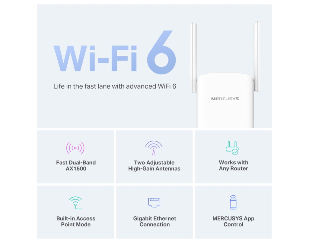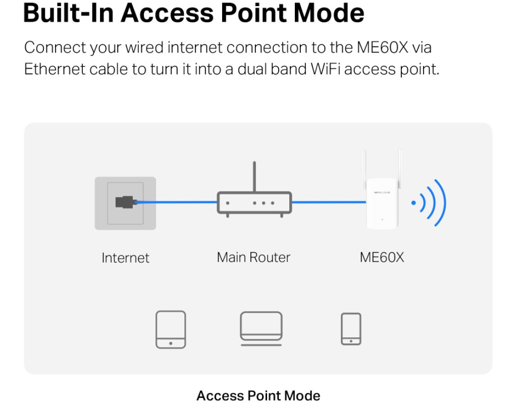 | Wi‑Fi 6 выводит подключение на новый уровень Стандарт Wi‑Fi 6 обеспечивает прирост по всем показателям, будь то скорость, эффективность или количество одновременно подключённых устройств. Создавайте Wi-Fi там, где он нужен Одного роутера почти всегда недостаточно для создания хорошего покрытия Wi‑Fi во всём доме. Усилитель с двумя мощными регулируемыми антеннами устранит эту проблему и не оставит в доме ни одной зоны со слабым сигналом Wi-Fi. EasyMesh Технология EasyMesh позволяет создать во всём доме единую бесшовную сеть Wi‑Fi с одним именем и паролем из устройств разных производителей, что обеспечивает дополнительную гибкость и масштабируемость. Адаптивное построение маршрута Обеспечивает максимальную скорость работы сети, автоматически выбирая самое быстрое подключение к роутеру. Режим высокой скорости Позволяет использовать один диапазон для раздачи Wi-Fi, а второй — для обмена трафиком с роутером, что позволяет увеличить эффективность сети. Режим точки доступа ME60X — это больше, чем просто усилитель сигнала Wi‑Fi. Подключите его к интернету по кабелю Ethernet, чтобы превратить усилитель в двухдиапазонную точку доступа Wi‑Fi. |