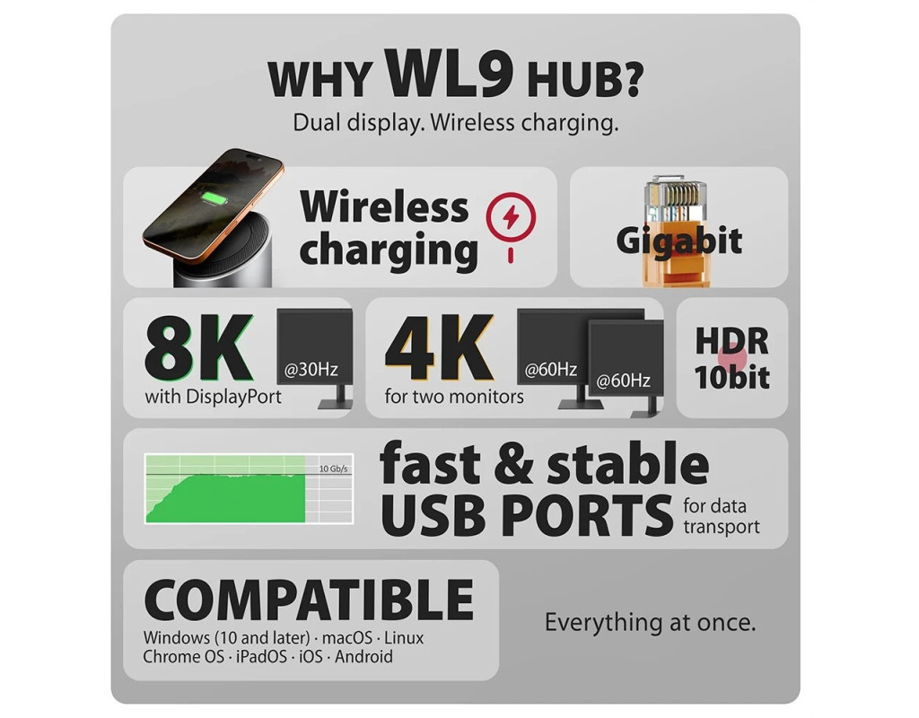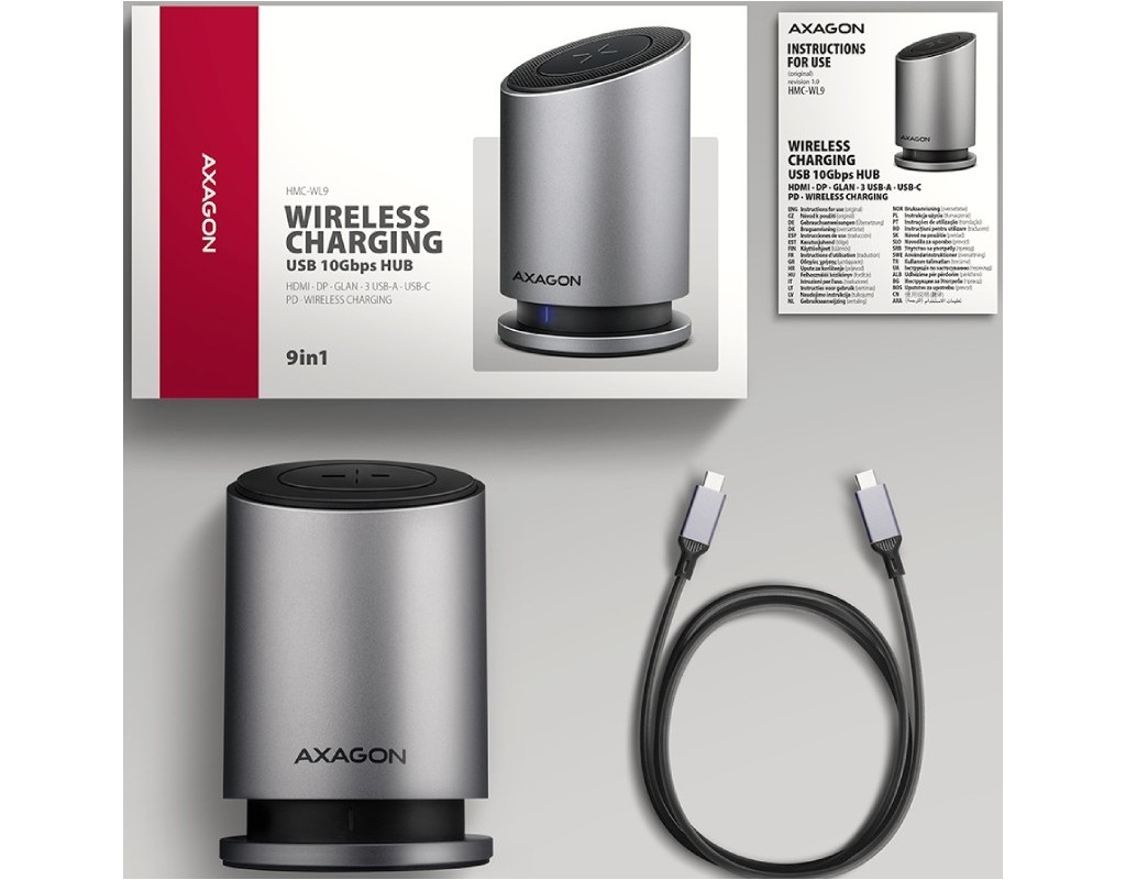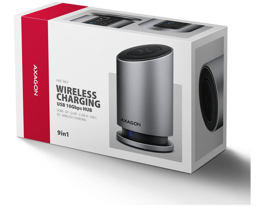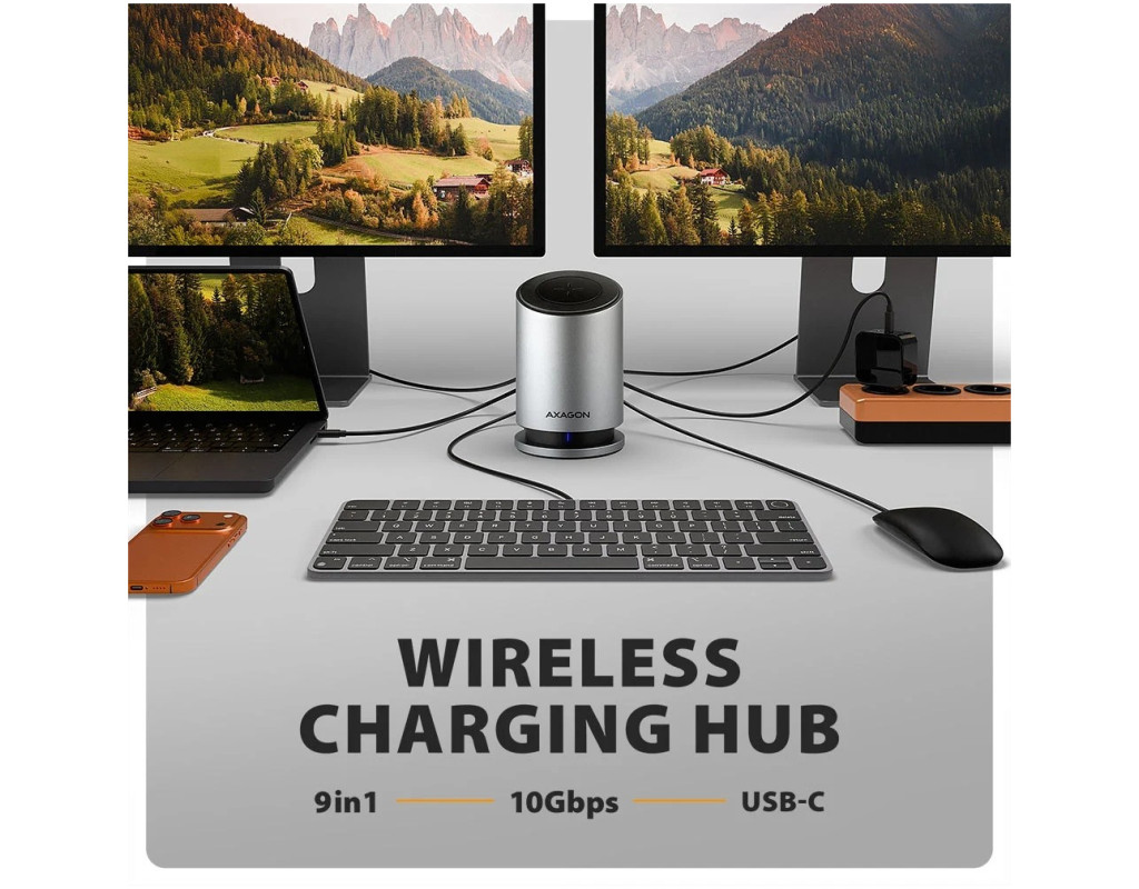 | Универсальное рабочее место в одном компактном решении AXAGON HMC-WL9 – это профессиональная док-станция нового поколения, объединяющая скоростной USB-C интерфейс, поддержку двух внешних мониторов, гигабитный LAN, широкие возможности подключения периферии и встроенную беспроводную зарядку мощностью до 1 Такой хаб способен превратить любой ноутбук или смартфон в полноценную рабочую станцию. Скоростной USB-хаб 10Gbps для профессиональных задач Модель обеспечивает: