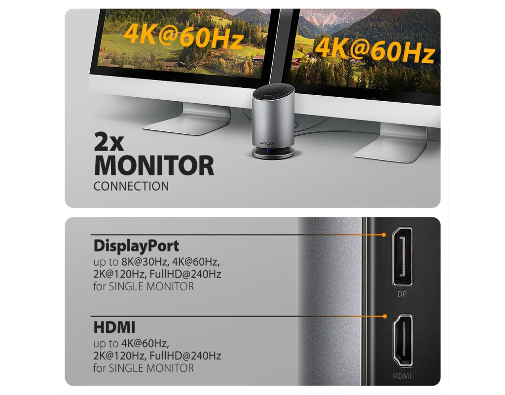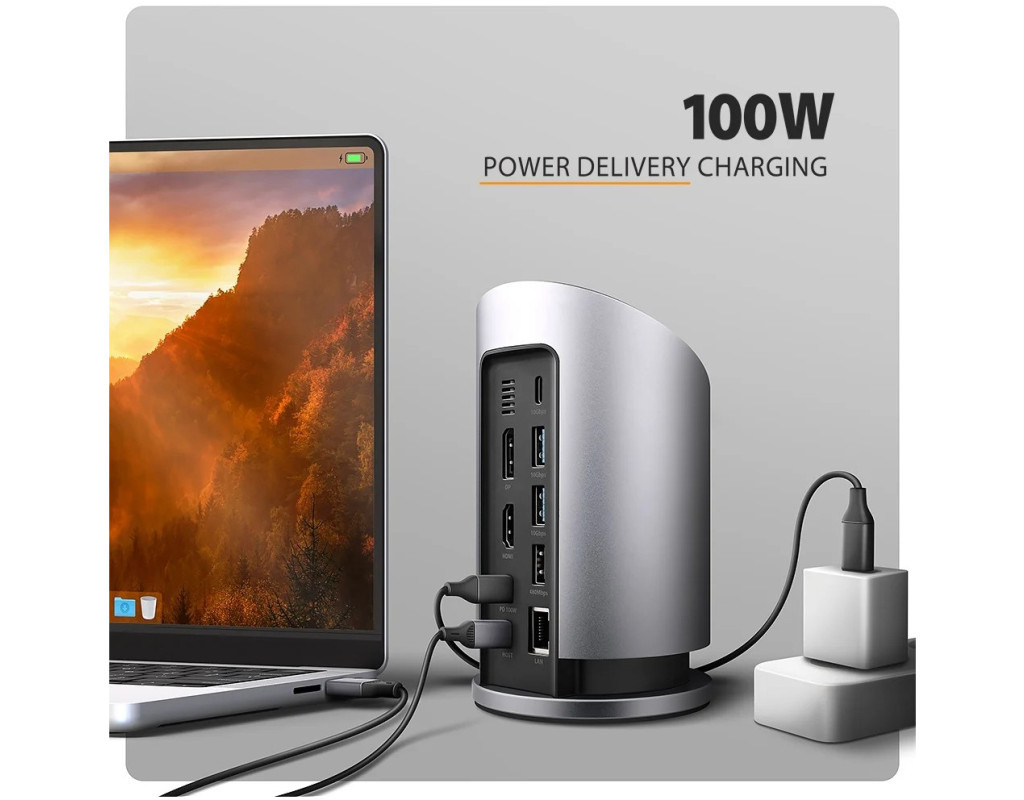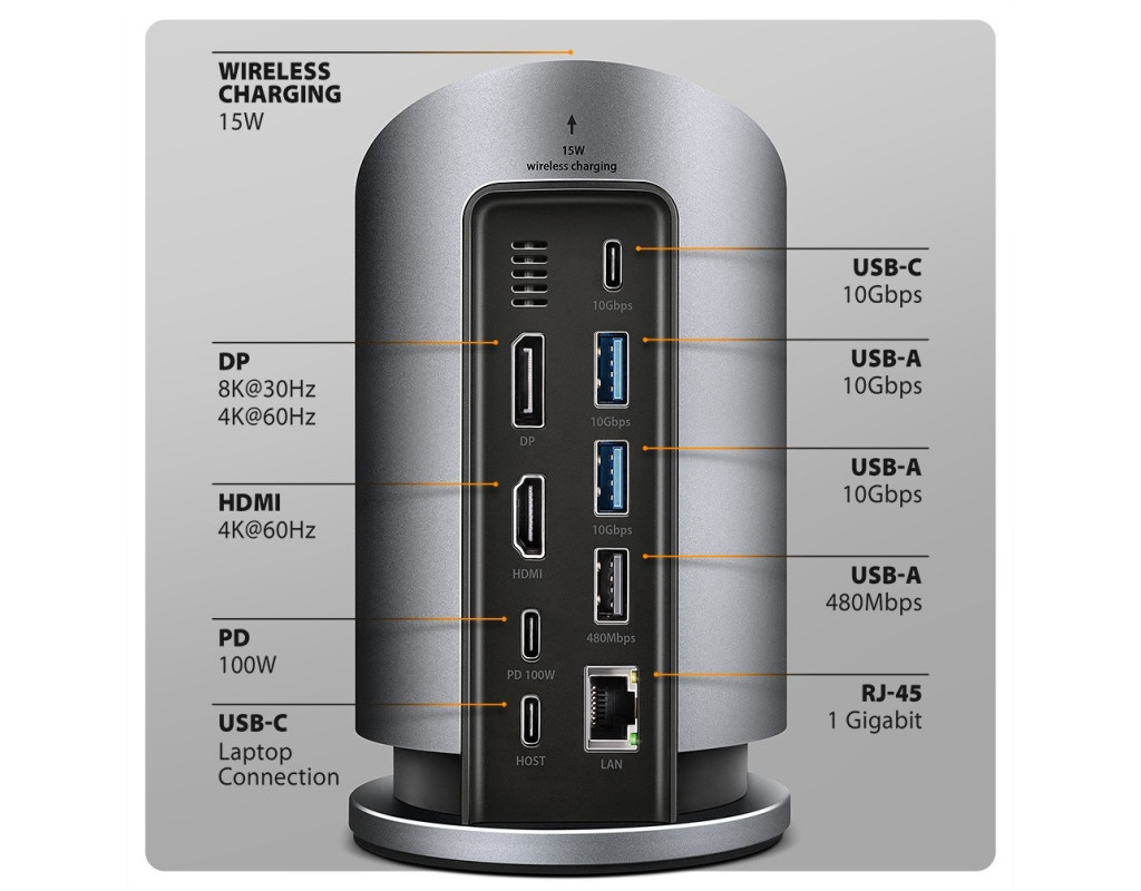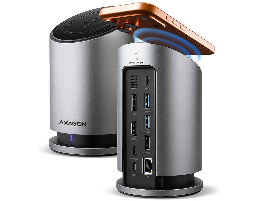 | Универсальное рабочее место в одном компактном решении AXAGON HMC-WL9 – это профессиональная док-станция нового поколения, объединяющая скоростной USB-C интерфейс, поддержку двух внешних мониторов, гигабитный LAN, широкие возможности подключения периферии и встроенную беспроводную зарядку мощностью до 1 Такой хаб способен превратить любой ноутбук или смартфон в полноценную рабочую станцию. Скоростной USB-хаб 10Gbps для профессиональных задач Модель обеспечивает: