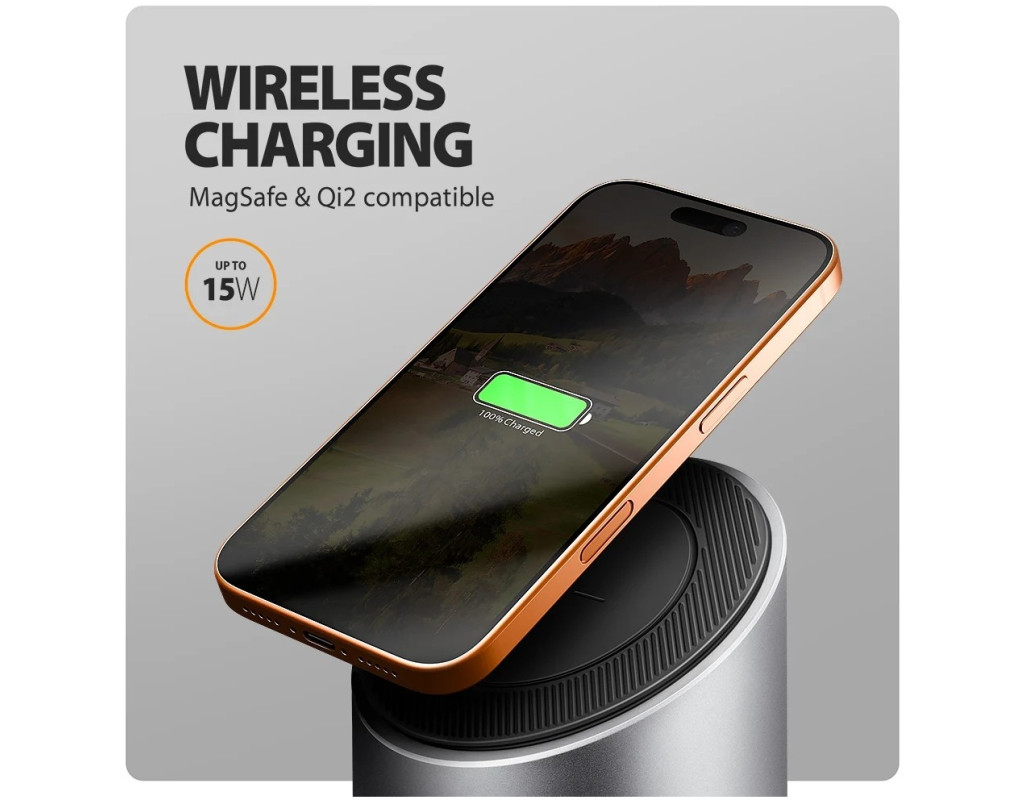 Беспроводная зарядка MagSafe/Qi – мощная и удобная В верхнюю панель интегрирована 15-ваттная беспроводная зарядка с магнитным выравниванием. Достаточно положить смартфон – он автоматически найдет оптимальную позицию для эффективной, быстрой и безопасной зарядки. Поддерживаются стандарты: Qi1, Qi2, MagSafe. Гигабитный LAN для стабильного интернета Встроенный Gigabit Ethernet (RJ‑45) гарантирует надежную проводную связь – идеально для офисной работы, стриминга, онлайн-конференций и высокоскоростной передачи данных. Продуманный дизайн и универсальная совместимость
