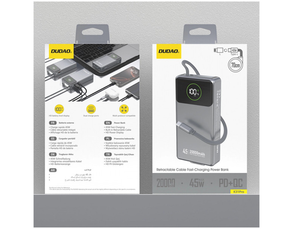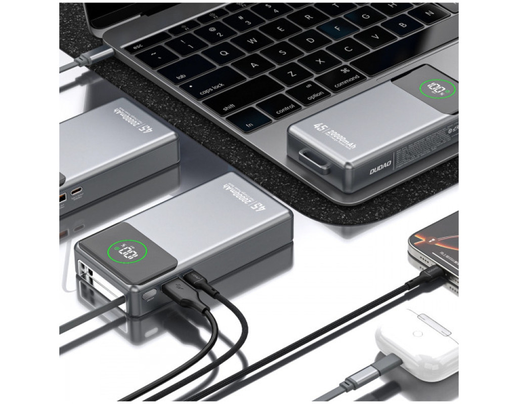 Dudao K31 Pro – это мощное портативное зарядное устройство емкостью 20 000 мАч, разработанное для пользователей, которым нужна высокая мощность и полная мобильность. Он поддерживает быструю зарядку до 45 Вт и стандарты PD, QC и VOOC, эффективно питая ноутбуки, планшеты, смартфоны и другие устройства. Встроенный выдвижной кабель USB-C упрощает ежедневное использование, а четкий светодиодный дисплей информирует уровень заряда батареи. Прочный серый корпус и практичный кабель делают Dudao K31 Pro надежным источником питания в любой ситуации.
