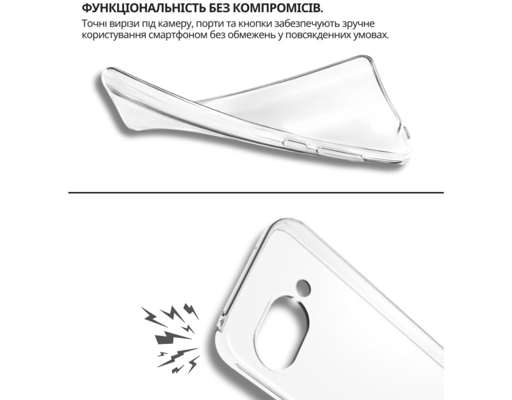 | "Тонкий і еластичний силіконовий чохол забезпечує надійний захист вашого смартфона від механічних пошкоджень, запобігаючи появі подряпин на корпусі. Завдяки високій якості матеріалу, чохол зберігає свою цілісність — він не рветься та не тріскається навіть при тривалому використанні. Чохол легко встановлюється, щільно прилягає до поверхні смартфона, не залишаючи повітряних зазорів, які могли б накопичувати пил, бруд або вологу. Легкий і непомітний, він не додає зайвого об'єму чи ваги вашому пристрою, забезпечуючи надійний захист від ударів, пошкоджень і вологи. Усі вирізи в чохлі точно відповідають роз'ємам і функціональним кнопкам смартфона, що гарантує зручне користування в будь-яких умовах. Силіконове покриття не ковзає, щільно облягає металевий корпус телефону та не перешкоджає доступу до роз'ємів для зарядки, USB-кабелю, гарнітури чи сканера відбитків пальців. Цей силіконовий чохол стане ідеальним вибором для тих, хто шукає стильний і практичний аксесуар для свого смартфона." |