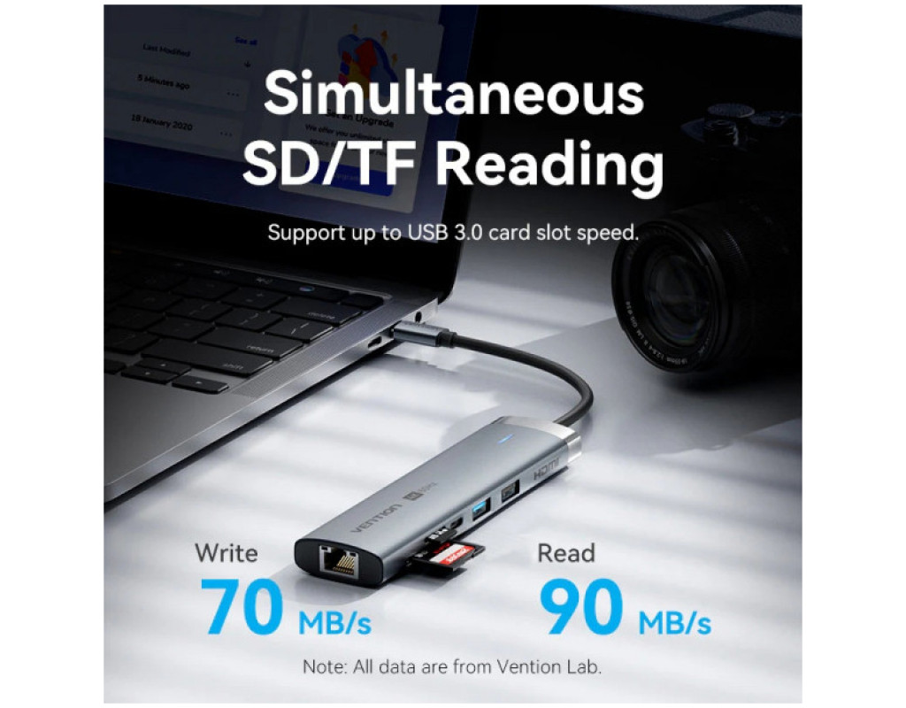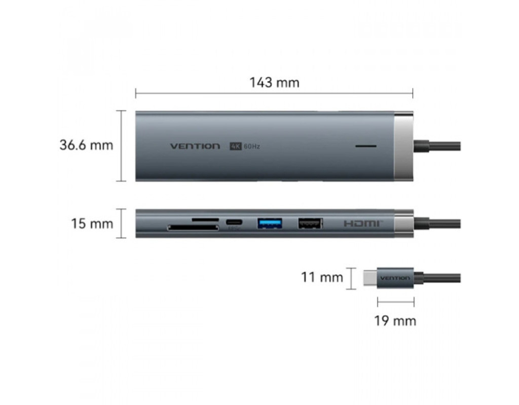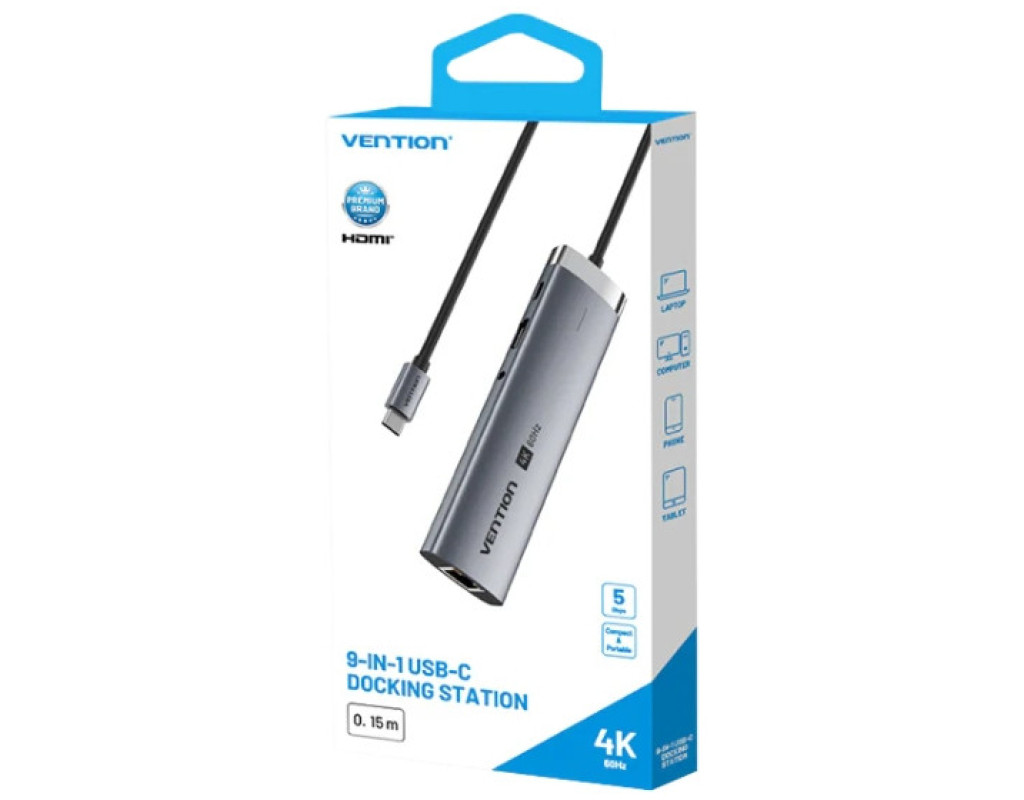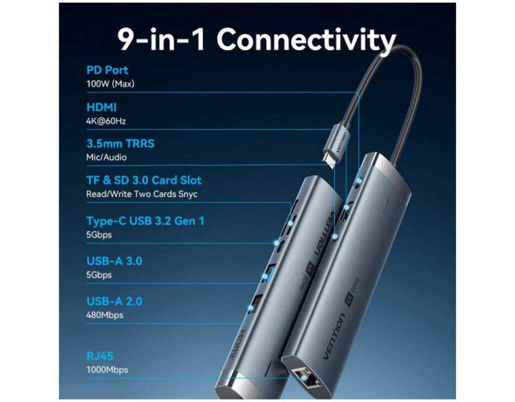 Концентратор VENTION USB-C 9-in-1 HDMI 60Hz + 2xUSB 3.0 + RJ45 + SD/TF + 3.5mm + PD 100W (TGVHB)