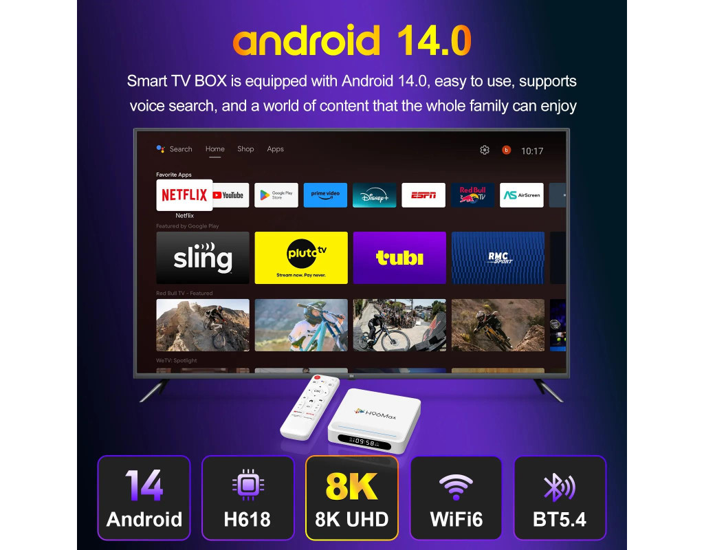 Смарт ТВ-бокс H96 Max H618 Plus 4/32 – это доступное, мощное и функциональное устройство для просмотра цифрового телевидения, стриминговых сервисов и игр на Android TV с поддержкой NETFLIX. H96 Max H618 Plus 4/32 – это ТВ-Бокс от известного производителя H96 на 4-ядерном процессоре Allwinner H618 с мощным графическим процессором Mali G31 MP2. На Смарт-ТВ приставку установлена ОС Android TV 14 с Google Assistant и интуитивно понятный интерфейс. В комплекте идет компактный и современный Bluetooth пульт со встроенным микрофоном для голосовых команд. ТВ-бокс поддерживает Wi-Fi 2.4 и 5 ГГц стандарта Wi-Fi 6 и имеет модуль Bluetooth для подключения наушников или геймпадов. Основные обновления: Компактный и современный пульт Bluetooth со встроенным микрофоном для голосовых команд. Обновлен модуль Wi-Fi с поддержкой 2.4 и 5 ГГц стандарта Wi-Fi 6 для более стабильного и быстрого подключения. Операционная система Android TV 14 с Google Assistant и интуитивно понятным интерфейсом. Цена осталась на уровне ТВ-боксов среднего сегмента, что делает его доступным, несмотря на широкий функционал в новой модели. H96 Max H618 Plus 4/32 – это идеальный выбор для тех, кто хочет больше возможностей по разумной цене! Основные преимущества: Современная ОС Android TV 14 с Google Assistant, голосовым поиском и интуитивно понятным интерфейсом. Удобное управление – компактный Bluetooth-пульт со встроенным микрофоном для голосовых команд. Широкие возможности подключения – LAN, Wi-Fi6 (2.4/5 ГГц), HDMI, USB 2.0*2, AV. Мощный процессор Allwinner H618 (4 ядер Cortex-A53, 1.5 ГГц) для стабильной работы. Достаточно памяти – 4 ГБ RAM + 32 ГБ встроенной памяти. Доступ к популярным сервисам – YouTube, Netflix, Megogo, SWEET.TV и другим без необходимости аналогового или спутникового ТВ. |