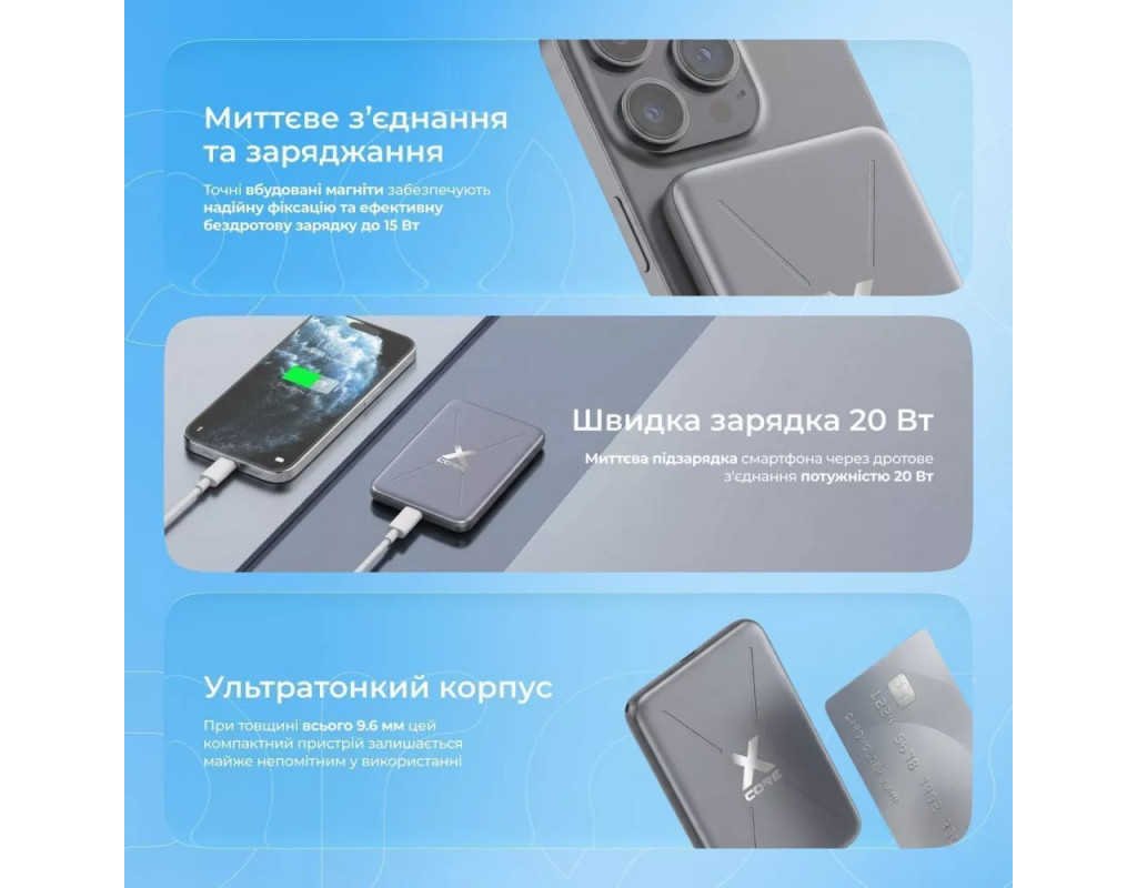 Универсальность Proove X-Core – это стильное, тонкое и мощное решение для ежедневного использования. Портативный павербанк благодаря компактному размеру приятно лежит в руке, а также умещается в кармане, что делает его идеальным для активного образа жизни. Качество Аккумулятор емкостью 5000 мАч литий-полимерного типа обеспечивает стабильную работу, безопасность и долговечность. Павербанк поддерживает беспроводную зарядку по стандарту Qi с мощностью до 15W, что позволяет заряжать смартфоны, наушники и другие совместимые Qi устройства. Это удобно, быстро и без лишних проводов. Кроме того, павербанк поддерживает популярные протоколы быстрой зарядки, что гарантирует оптимальную скорость и совместимость с большинством современных устройств. Быстрая зарядка Максимальная выходная мощность проводной зарядки составляет 20W, что позволяет быстро восстанавливать заряд даже энергоемких гаджетов. Для удобного использования павербанк оснащен переключателем, индикаторами уровня заряда и отверстием для ремешка, что позволяет легко прикрепить его к сумке или рюкзаку. |