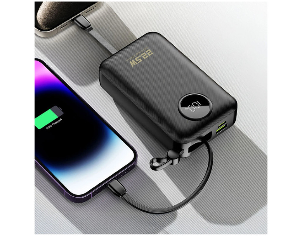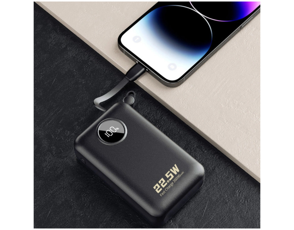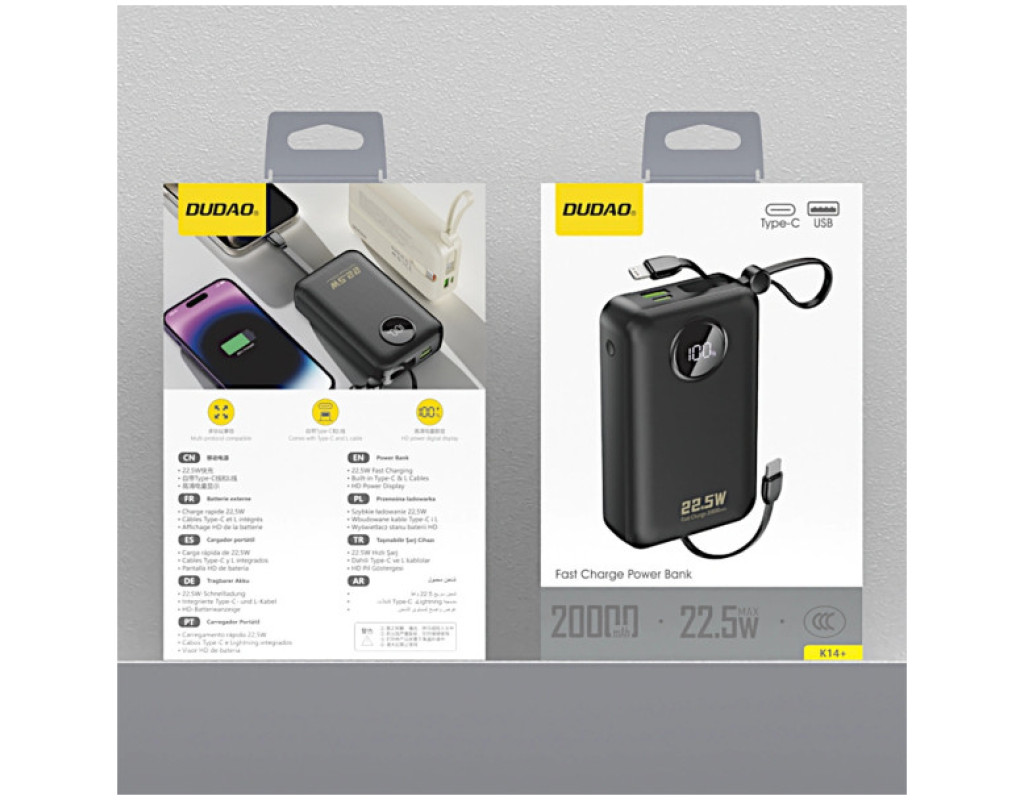 Батарея универсальная Dudao 20000mAh K14+ 22.5W, PD, QC, USB-A, USB-C(In/Out), with built-in USB-C/Lightning cables, Black (6977196680016)