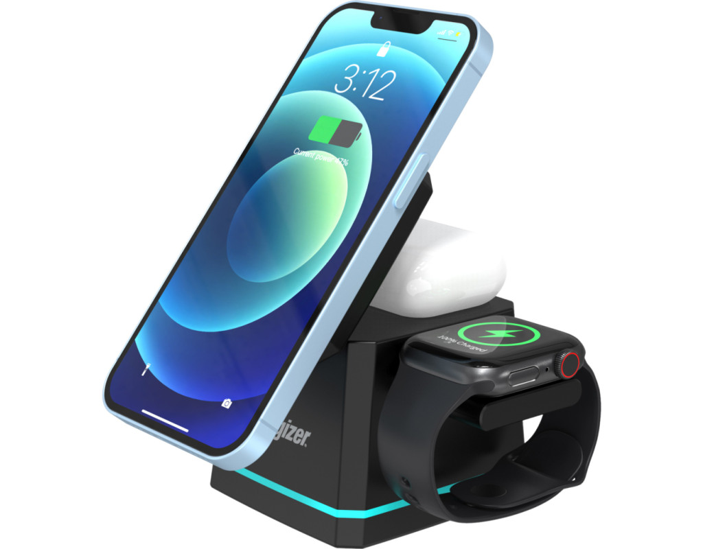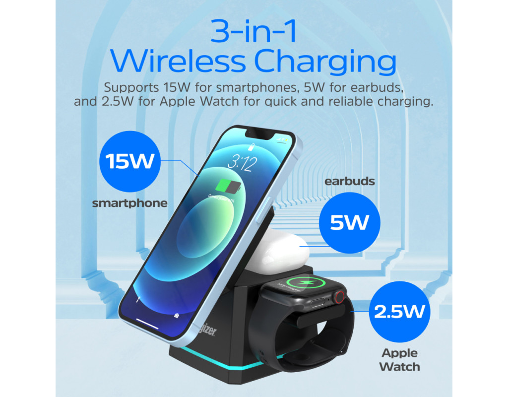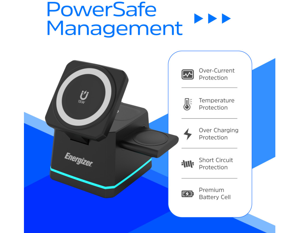 Беспроводное магнитное зарядное устройство 3-в-1 Energizer WCP307 — удобное и современное решение для одновременной зарядки нескольких гаджетов. Модель разработана для быстрой и безопасной индуктивной зарядки смартфонов с поддержкой QI, а также TWS-наушников и смарт-часов. Продуманная эргономичная конструкция позволяет комфортно разместить все устройства на одной зарядной площадке, сохраняя порядок на рабочем столе или тумбе. Магнитная фиксация смартфона обеспечивает стабильное положение и точное позиционирование для эффективной передачи энергии. Зарядное устройство оснащено мягкой голубой светодиодной подсветкой, которая создает уютную атмосферу и облегчает поиск устройства в темное время суток, не мешая спать или отдыху. Особенности и преимущества
