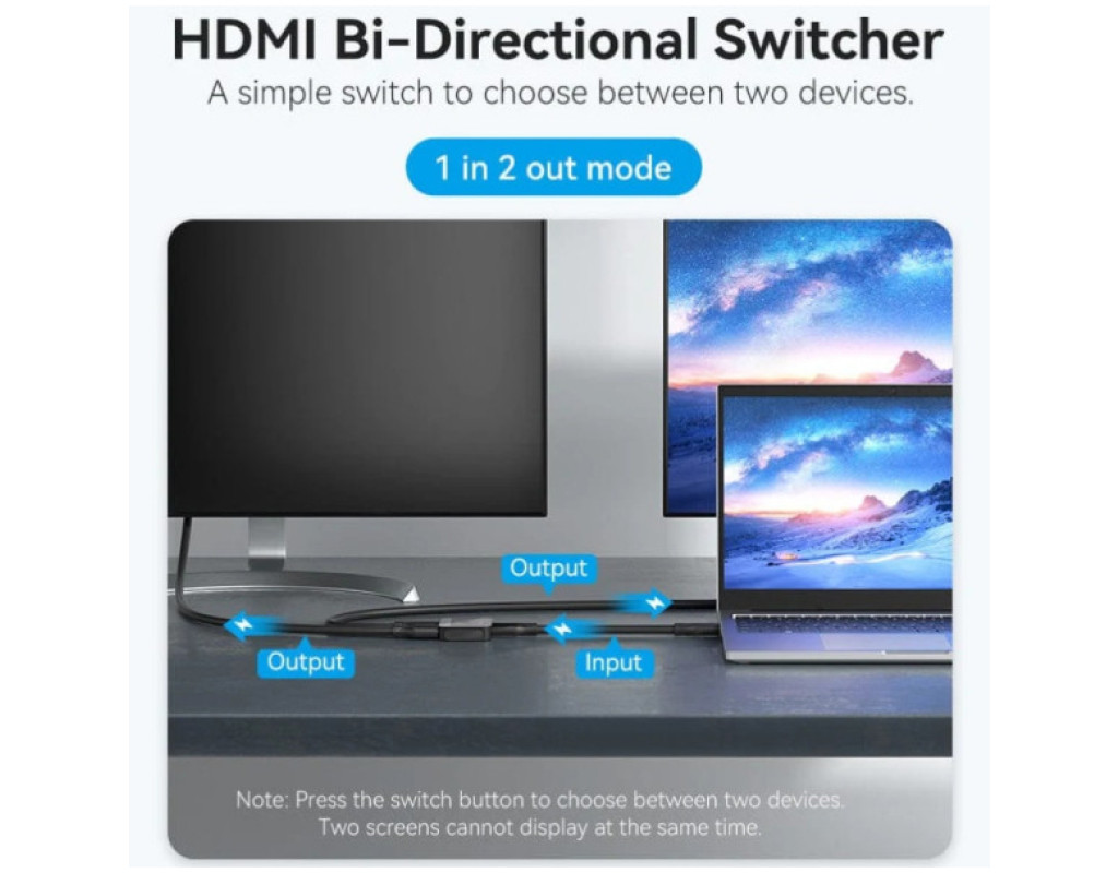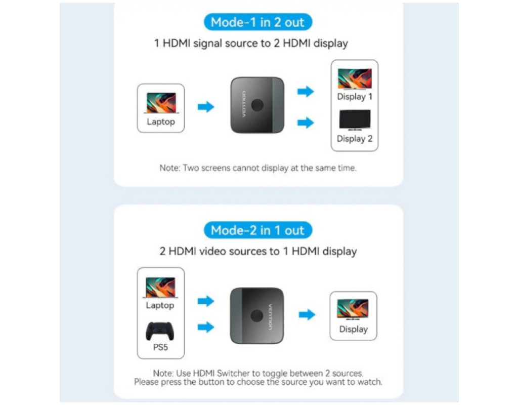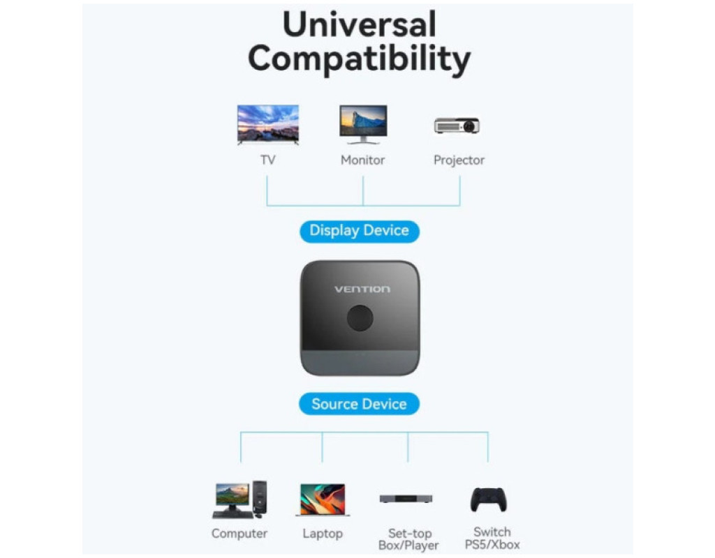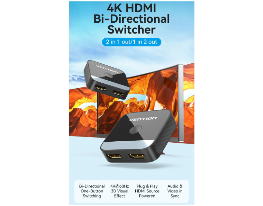 Свитч Vention HDMI 2.0 (AKOB0) – это 2-х направленный HDMI разветвитель, который предназначен для передачи цифрового аудио и видео HDMI сигнала от одного HDMI-источника (компьютер, медиаплеер, DVD-проигрыватель, ноутбук и т.д.) по очереди на 2 устройства с входом HDMI (телевизор, плазменная панель, проектор, монитор и т.д.). |