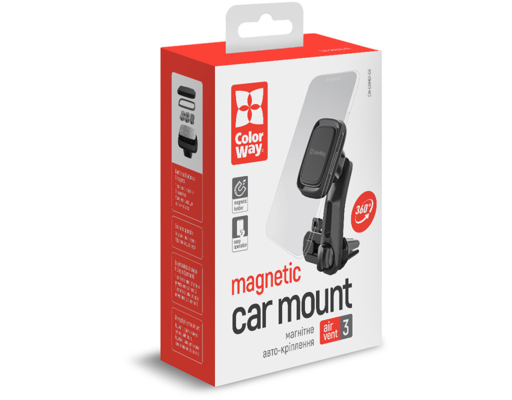 Компактный универсальный автодержатель СolorWay для телефона магнитный Air Vent-3 (360° rotation) Gray со встроенным магнитом – идеальное решение для фиксации вашего гаджета в салоне автомобиля. Совместимый с устройствами большинства брендов, изготовлен из пластика высокого качества. Конструкция держателя обеспечивает свободный доступ к разъему питания устройства. Магнитная фиксация возможна помещением или поклейкой пластины под заднюю панель телефона. Аксессуар надежно крепится на воздуховод в салоне автомобиля, а специальный кронштейн позволит регулировать расположение устройства на панели. С помощью круговых движений выбрать идеальную высоту, смещать по необходимости вправо-влево, вверх или вниз. Дополнительно механизм вращения на 360° позволит выставить Ваш девайс самым комфортным для Вас образом, не препядствуя и не прикрывая обзор водителю, а мощные неодимовые магниты обеспечат полную безопасность и помогут предотвратить выпадение гаджета даже при сильной тряске. Особенности