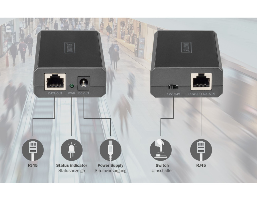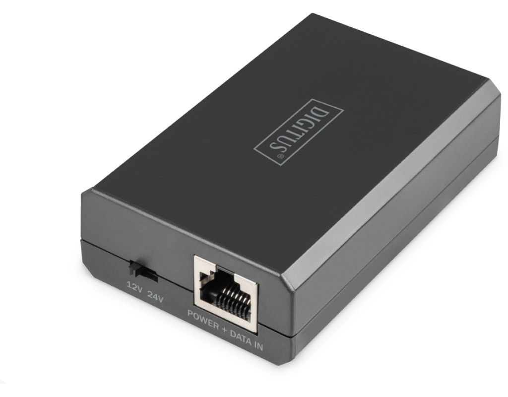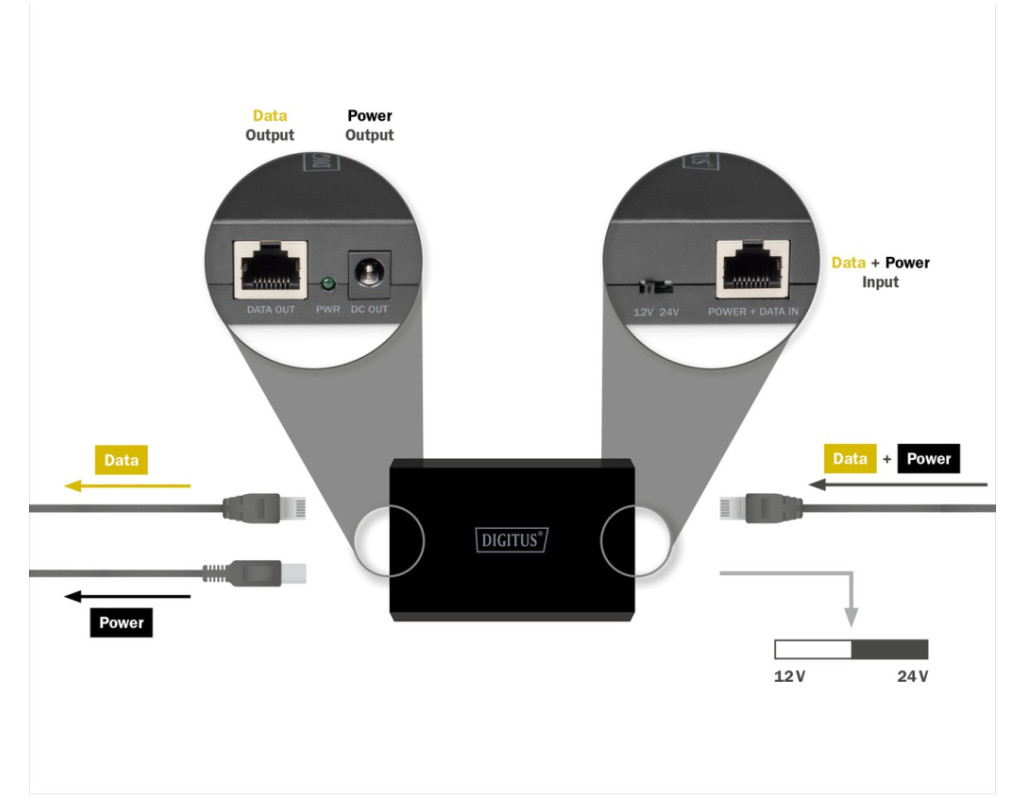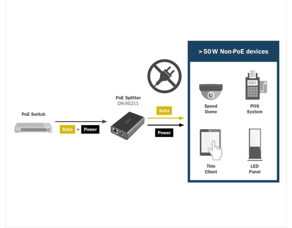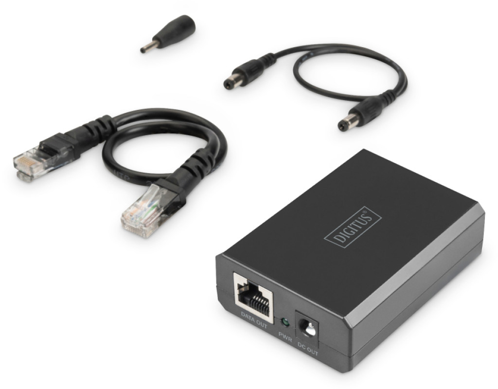 | Digitus DN-95211 — PoE-разветвитель, подающий данные и питание через один Ethernet-кабель на устройстве без поддержки PoE (IP-камеры, точки доступа, телефоны). Поддерживает скорость до 1 Гбит/с, стандарт IEEE 802.3at/bt, выбор выходного напряжения 12 В или 24 В (до 51 Вт). Имеет LED-индикатор, защиту от перегрева и короткого замыкания, работает по принципу Plug & Play без дополнительной настройки. |