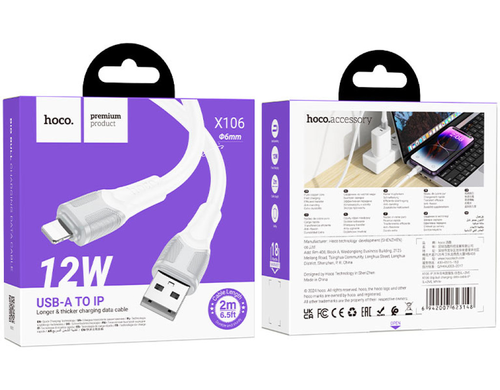 Кабель Hoco X106, Lightning-USB, 2,4A, довжина 2м, White, BOX