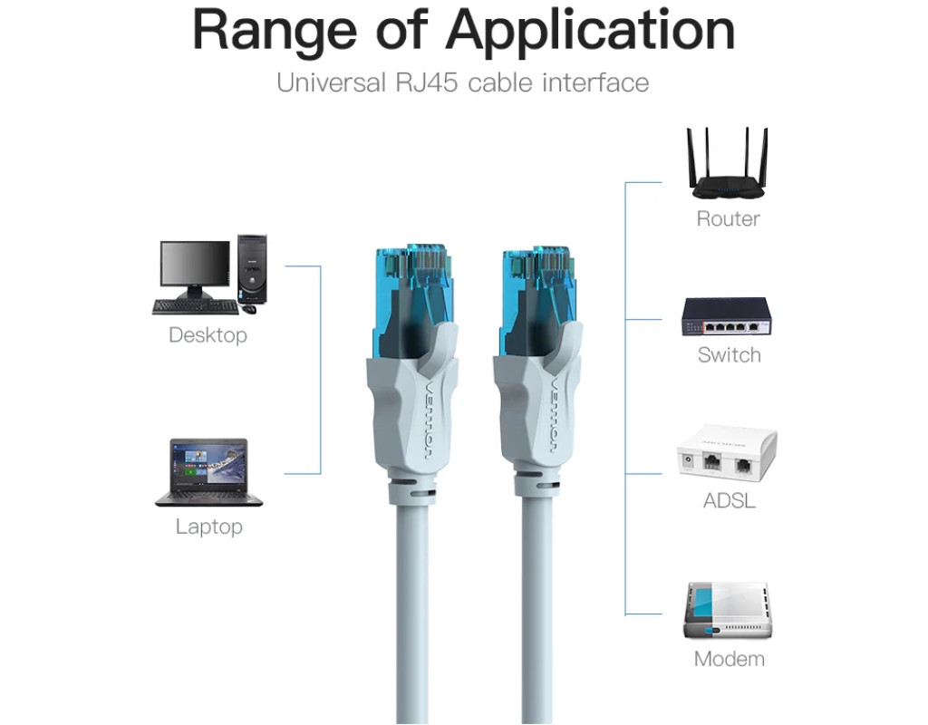 Кабель Cat 5e используется в сетевых приложениях, таких как технологии 10Base-T, 100Base-T, 1000Base-T Ethernet до 100 метров (328 футов), и был разработан специально для приложений Gigabit Ethernet (Gigabit по меди). Они обеспечивают высокую скорость передачи данных и работают с любыми гигабитными скоростными продуктами. Эти кабели обеспечивают улучшенную производительность по сравнению со стандартными кабелями Cat5. Патч-кабель Vention CAT5E UTP представляет собой апробированный кабель стандарта CAT5E с неэкранированной витой парой (UTP). CAT5E полностью обратно совместим с современным оборудованием CAT5. Кабели Vention CAT5E состоят из 4 пар многожильных проводов 26AWG с оболочкой из ПВХ. Жилы соединены с позолоченными разъемами RJ45 в соответствии со стандартом TIA/EIA 568B. Используется для подключения вашей сетевой карты к любому из следующего: