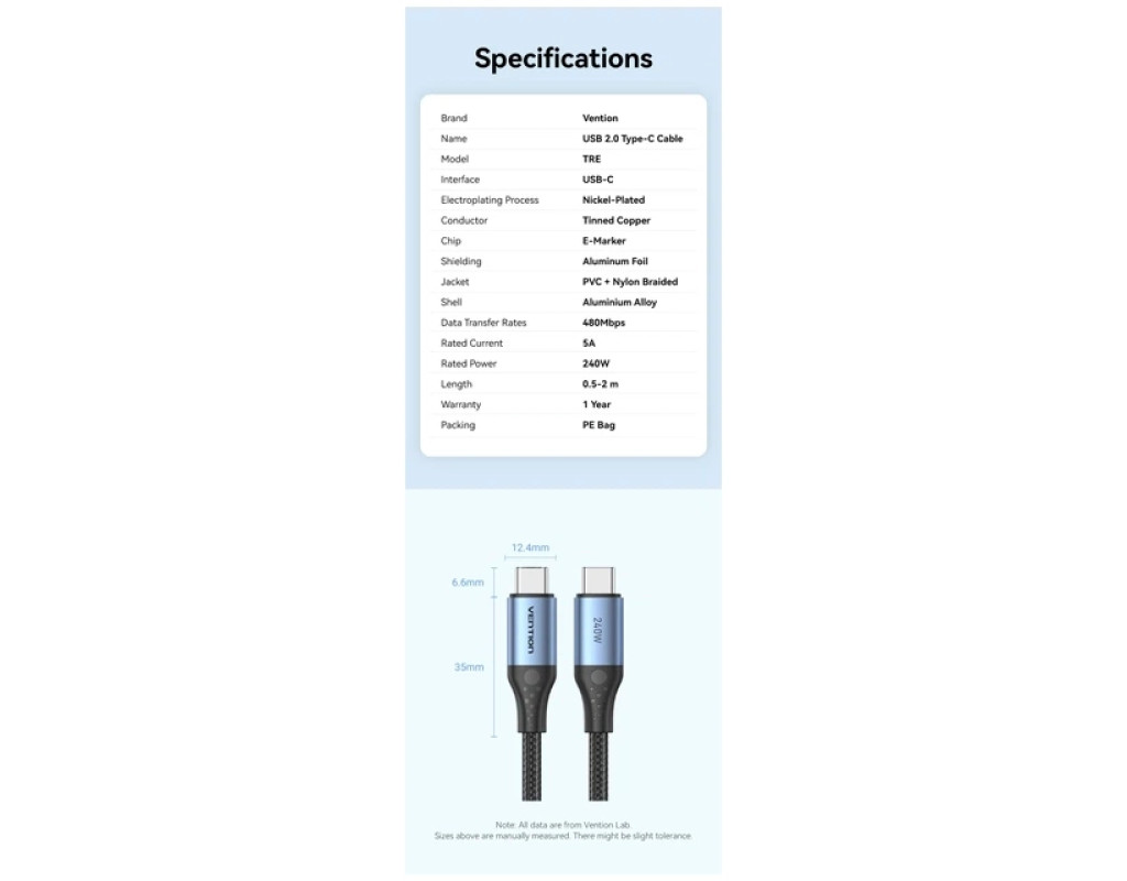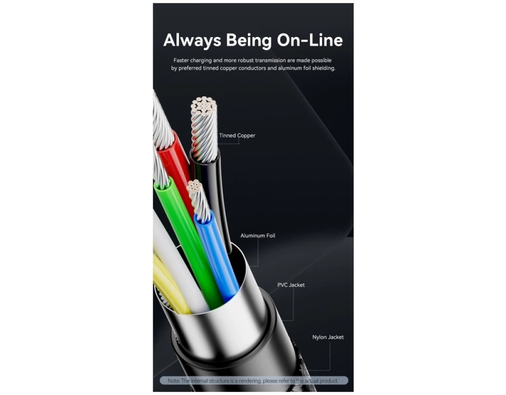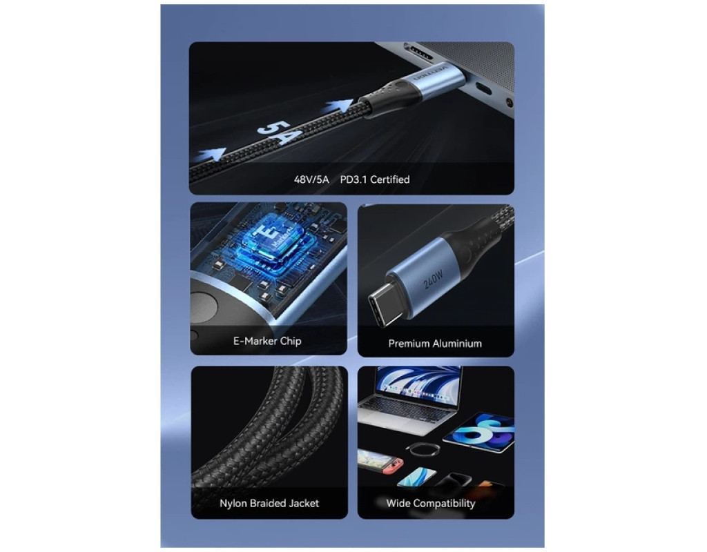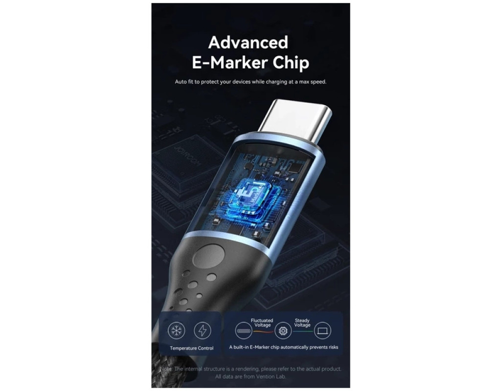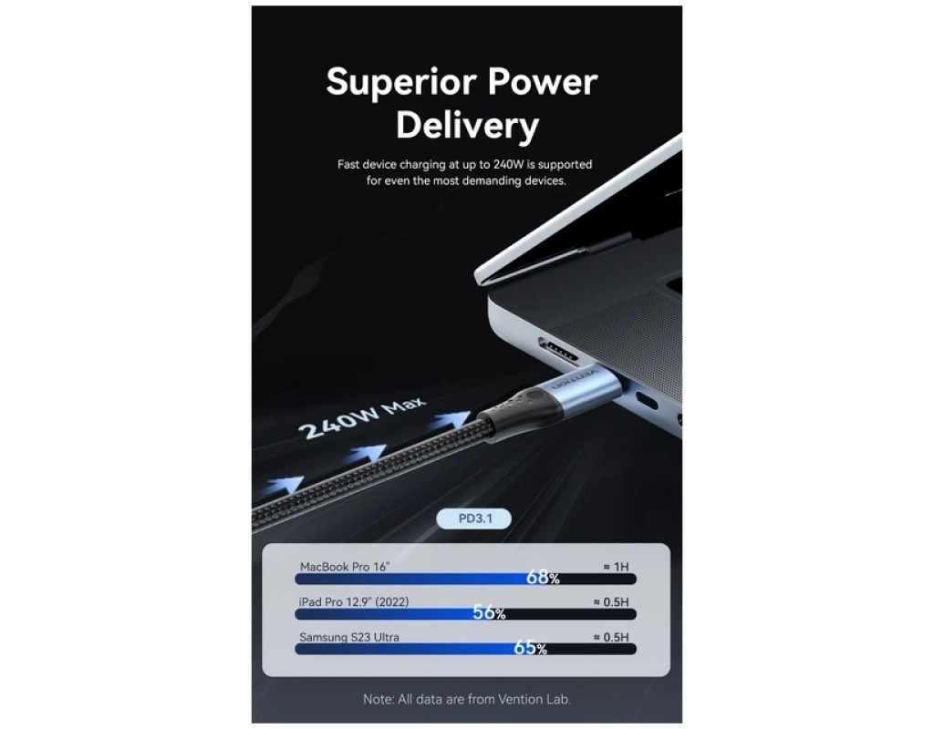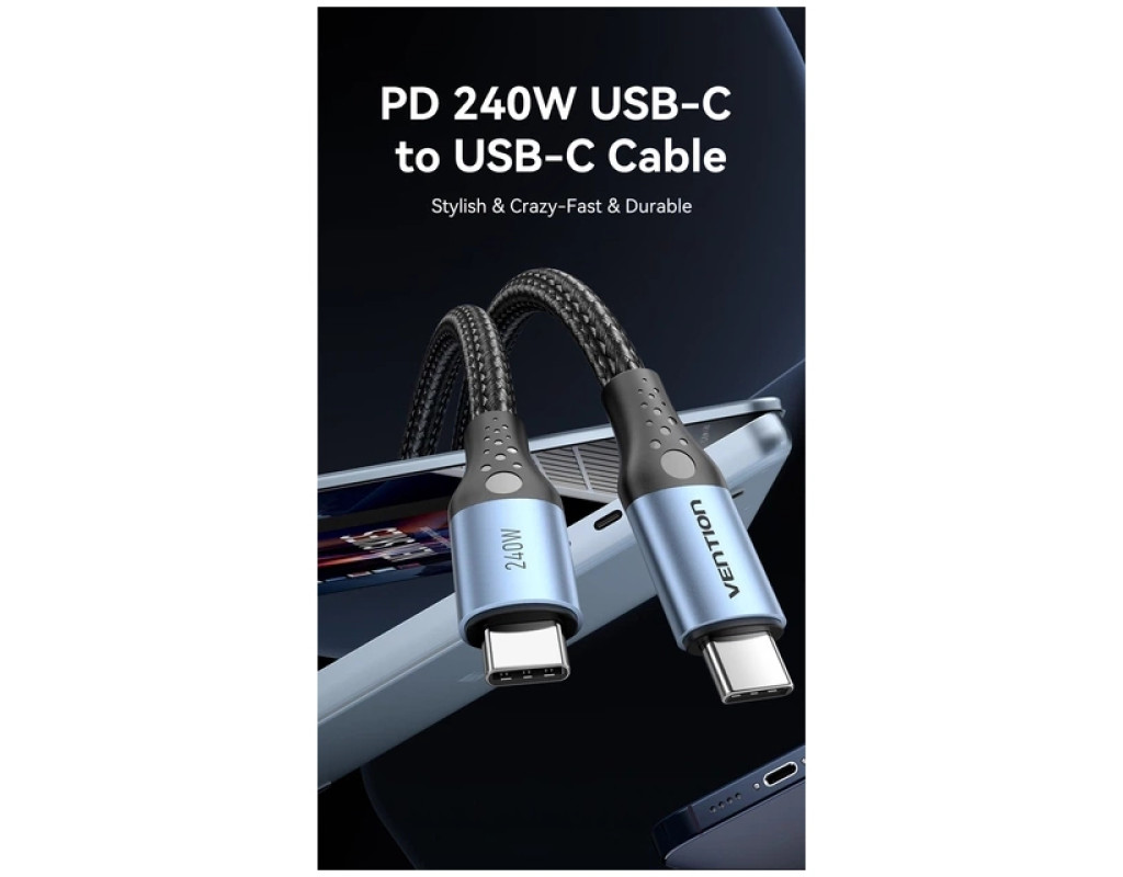Кабель Vention USB-C на USB-C 240 Вт PD 3.1 1.5 м Черный (TREBG) Этот кабель Vention USB-C на USB-C разработан для обеспечения зарядки нового поколения, поддерживая новейший стандарт Power Delivery 3.1 для поразительной выходной мощности до 240 Вт. Созданный для пользователей высокопроизводительных устройств, таких как MacBook Pro 16", игровые ноутбуки и флагманские смартфоны, как серия Samsung S23 Ultra или iPhone 15, он гарантирует максимально быстрое и безопасное питание вашей электроники. Длина 1,5 метра обеспечивает идеальный баланс между гибкостью и радиусом. кровати или путешествий. Изготовленный с коннекторами из алюминиевого сплава премиум-класса и прочной нейлоновой оплеткой извне, этот черный кабель сочетает в себе элегантный эстетичный вид и чрезвычайную долговечность, чтобы выдерживать строгие условия ежедневного использования, обеспечивая при этом эффективную синхронизацию. Обязательное примечание Этот кабель позволяет заряжать устройства и передавать данные на скорости USB 2.0 (480 Мбит/с), но не поддерживает вывод видеосигнала или подключение мониторов. Чтобы использовать полную зарядную способность 240 Вт, и подключенный адаптер питания и устройство должны поддерживать протокол PD 3.1 со спецификацией 48 В/5 А, иначе скорость зарядки адаптируется к максимальным ограничениям используемого оборудования. Кабель оснащен коннекторами USB-C на обоих концах, что означает, что он несовместим со стандартными зарядными сетевыми устройствами USB-A и требует порта USB-C для подключения. Ключевые особенности: Поддержка Power Delivery 3.1 на 240 Вт: Этот кабель использует усовершенствованный протокол зарядки PD 3.1 для поддержания максимального тока 5 А и 48 В, что обеспечивает огромную выходную мощность 240 Вт. Это делает его исключительно способным питать самые требовательные ноутбуки на рынке, например, заряжать MacBook Pro 16" до 68% примерно за час, оставаясь при этом обратно совместимым с устройствами меньшей мощности, такими как планшеты и смартфоны, для быстрого пополнения заряда батареи. Интеллектуальный чип E-Marker: В корпус коннектора встроен умный чип E-Marker, действующий как центр контроля безопасности, непосредственно взаимодействуя с подключенными устройствами для регулирования потока энергии. Этот интеллектуальный компонент обеспечивает стабильную подачу напряжения и тока, активно контролируя температуру для предотвращения перегрева, перенапряжения и перегрузки по току, тем самым защищая здоровье аккумулятора и внутренние схемы вашей дорогой электроники во время высокоскоростной зарядки. Премиальная прочная конструкция: Созданный для износостойкости, кабель имеет черную нейлоновую оболочку высокой плотности, которая предотвращает спутывание и прошла более 10 000 испытаний на растяжение и 20 000 испытаний на изгиб в лабораторных условиях. Коннекторы заключены в корпус из никелированного алюминиевого сплава, который эффективно рассеивает тепло, а удлиненная усиленная резиновая защита в месте соединения служит для поглощения натяжения и предотвращения поломки в наиболее уязвимых точках. Универсальная совместимость устройств: Кабель предлагает широкую универсальность, бесперебойно работая с широким спектром USB-C устройств, включая ноутбуки от Apple, Dell, HP, Lenovo и ASUS, а также игровые консоли, такие как Nintendo Switch и Steam Deck. Он также совместим с современными смартфонами, такими как серия iPho