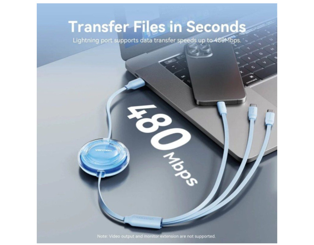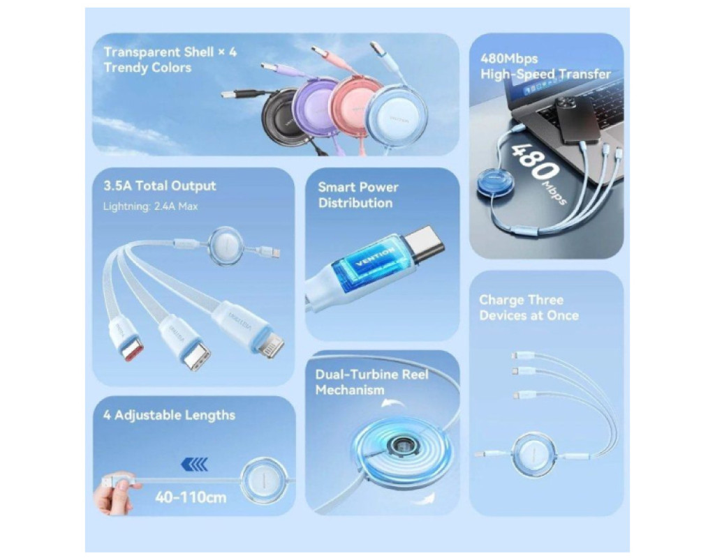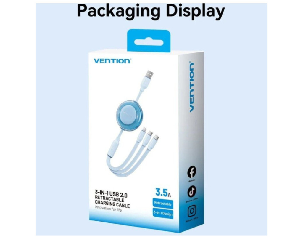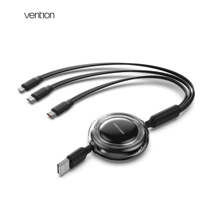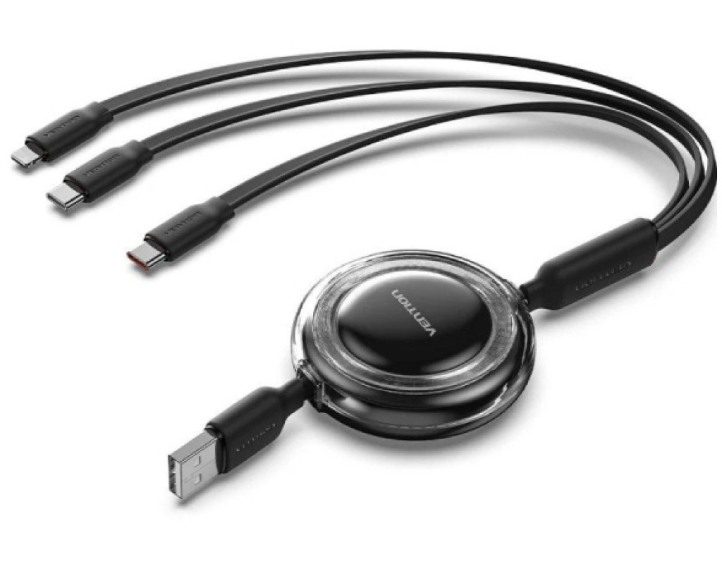 Модель TRJBBE – это именно многофункциональный ретракторный (вытяжной) кабель 3-в-1 от Vention с USB-A на два USB-C и Lightning – удобно для людей, пользующихся разными устройствами без нескольких отдельных кабелей |