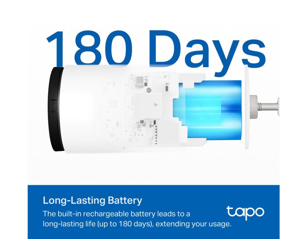 - До 180 днів роботи від одного заряду: потужний акумулятор зменшує частоту обслуговування. За потреби можна підключити сонячну панель Tapo A201 (продається окремо).