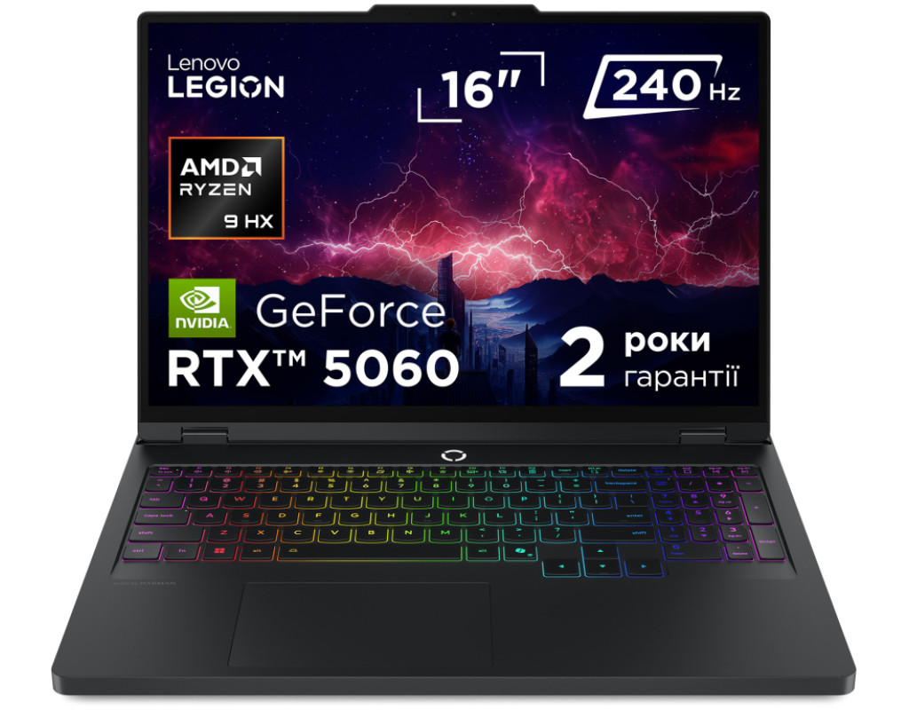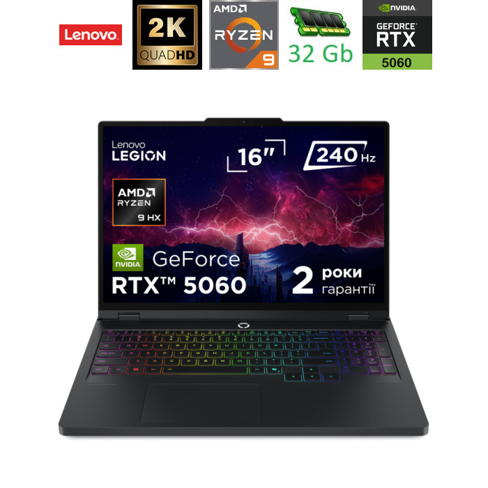 | Инновации, меняющие правила игры Ноутбук Lenovo Legion Pro 5 16ADR10 Eclipse Black (83LT008LRA) — это идеальный выбор для геймеров, создателей контента и технологических энтузиастов, которым нужны инструменты высочайшего уровня. Оснащённый ультрасовременными компонентами и инновационными функциями, этот ноутбук обеспечивает бескомпромиссную производительность и стиль, отвечая всем вашим требованиям. Экран 16" WQXGA IPS с поддержкой Dolby Vision® и DisplayHDR™ 400 воспроизводит изображение с профессиональной точностью, а частота обновления 240 Гц гарантирует плавность визуального контента. Legion Coldfront: Hyper с турбовентиляторами и медными тепловыми трубками позволяет ноутбуку оставаться холодным даже при наивысших нагрузках. Система Lenovo AI Engine+ автоматически оптимизирует ваши настройки для максимального FPS в режиме Performance, гарантируя непревзойдённую производительность как в сложных задачах, так и в самых интенсивных игровых баталиях. Мозг системы: реактивная скорость и ИИLegion Pro 5 10-го поколения оснащён процессором AMD Ryzen™ 9 8945HX, который устанавливает новые стандарты производительности. Благодаря 16 ядрам и 32 потокам этот процессор справляется с любой нагрузкой, включая многозадачность высокого уровня, видеомонтаж в 4K или даже разработку игр. Частота до 5.4 ГГц обеспечивает мгновенный отклик системы и плавное выполнение задач. В сочетании с интеллектуальной системой Legion AI Engine+ процессор делает это устройство непревзойдённым в своей категории, предлагая впечатляющий технологический опыт. Lenovo Legion Pro 5 идёт на шаг вперёд благодаря 32 ГБ оперативной памяти стандарта DDR5-5200, которая гарантирует высочайшую скорость обработки данных. Архитектура слотов памяти SO-DIMM позволяет легко обновить систему, сохраняя её актуальной на годы вперёд. Храните все свои проекты на 1 ТБ SSD — он обеспечит молниеносный доступ к данным и быструю загрузку программ. Графика нового поколенияЭкран 16" WQXGA (2560x1600) обеспечивает яркость 500 нит и 100% охват цветового пространства DCI-P3. Поддержка G-SYNC® и Free-Sync Premium, а также низкий уровень синего света делает этот дисплей безопасным для глаз и идеальным для длительных рабочих или игровых сессий. Картинка точная, динамичная и реалистичная благодаря заводской калибровке цвета, что подходит для профессионального цифрового контента. Графическая система представлена NVIDIA® GeForce RTX™ 5060 с 8 ГБ видеопамяти GDDR7. Благодаря передовой технологии DLSS 4 и искусственному интеллекту эта видеокарта открывает новые горизонты для геймеров и создателей контента — от фотореалистичных сцен до ускоренной обработки графики. Ноутбук оснащён стереодинамиками Harman мощностью 2×2 Вт, которые обеспечивают чистый, сбалансированный звук без искажений даже на высокой громкости. Аудиосистема усиливает визуальный опыт и подходит не только для игр, но и для видеомонтажа, просмотра фильмов и стриминга без наушников. Быстрая зарядка, стабильная связь, полный контрольНоутбук оснащён батареей 80 Вт·ч, которая поддерживает функцию Super Rapid Charge: всего за 30 минут вы получаете 70% заряда, а полная зарядка занимает лишь 80 минут. Это идеально для активных геймеров и креаторов, работающих в движении. Подключение через Wi-Fi 6 с поддержкой стандарта 802.11ax гарантирует сверхбыструю передачу данных и стабильное соединение даже в многопользовательской среде. Bluetooth 5.2 обеспечивает эффективную интеграцию с перифе