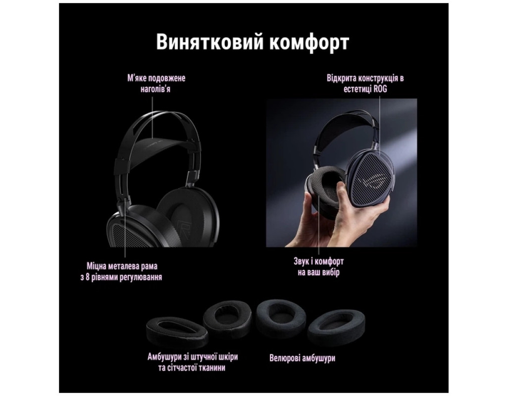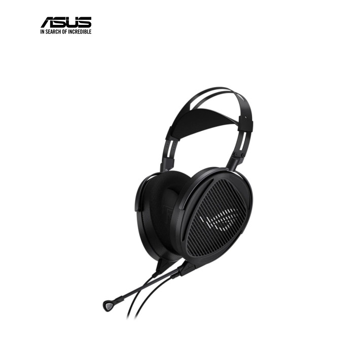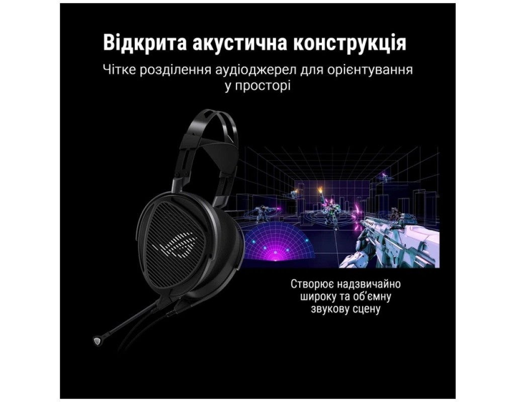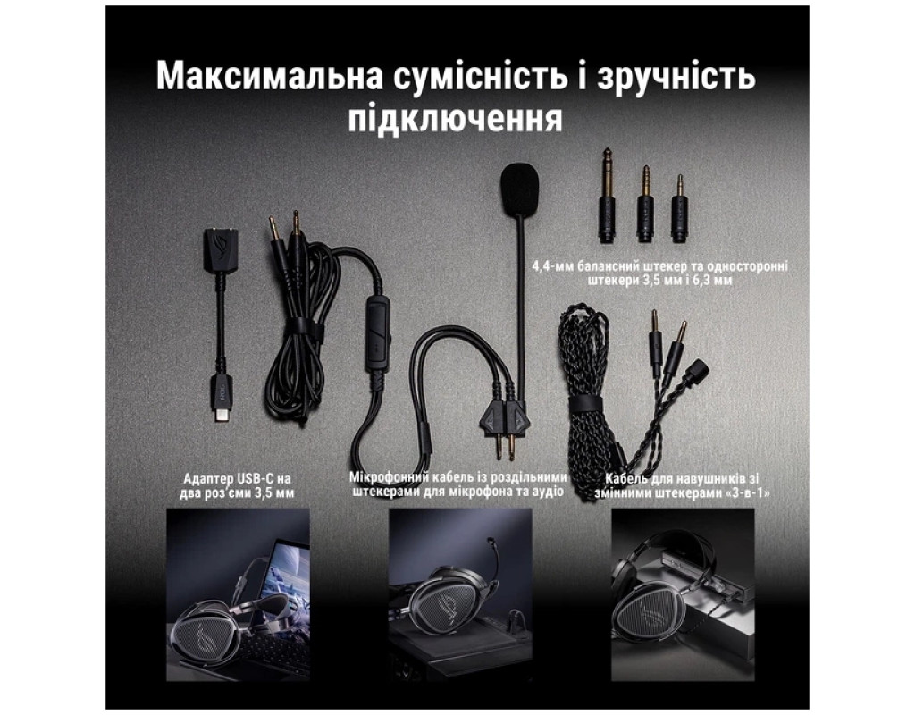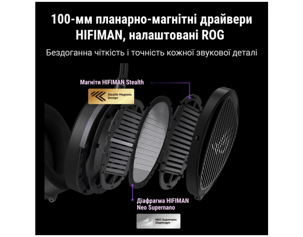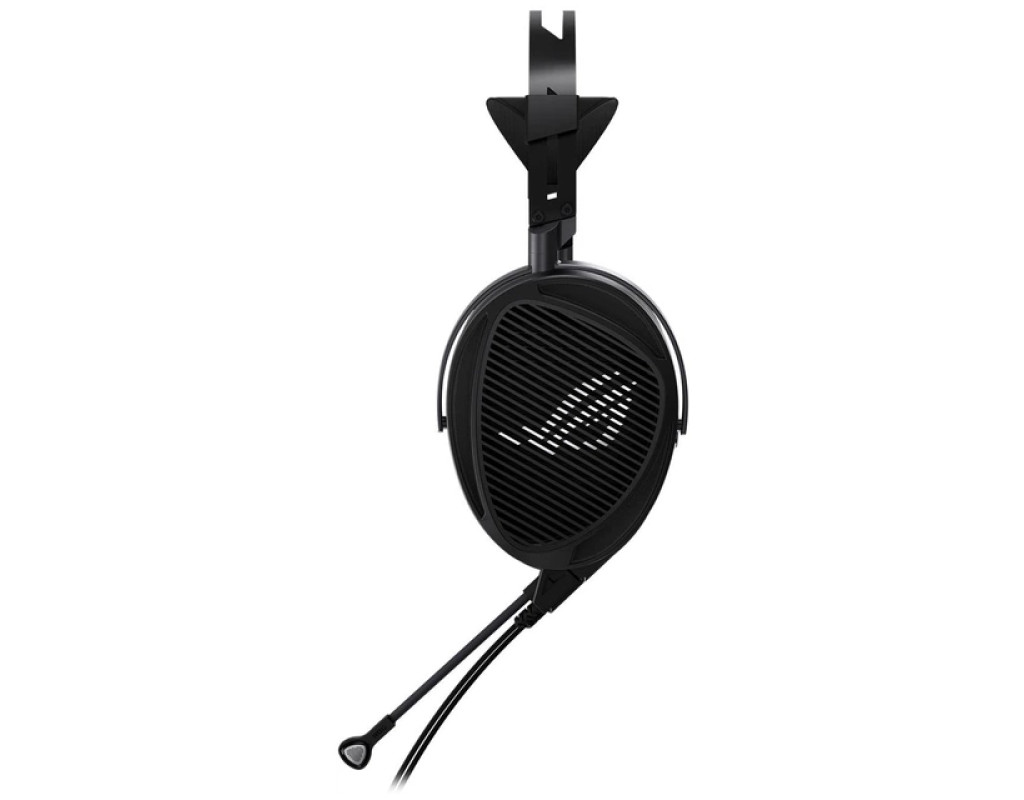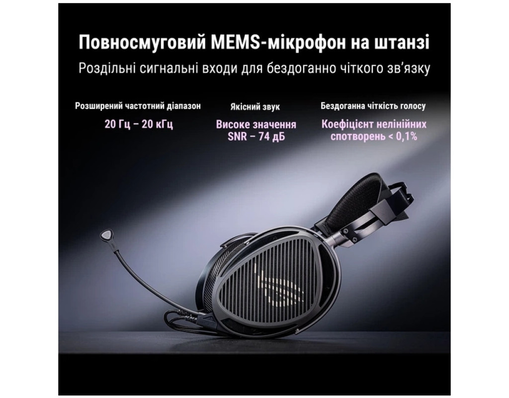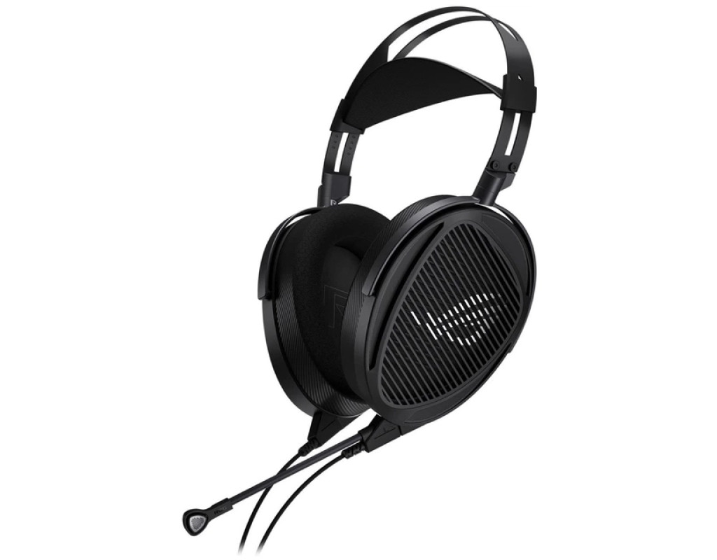Игровая гарнитура ROG Kithara с планарно-магнитными драйверами HIFIMAN 100 мм, настроенными ROG, открытой конструкцией, полнодиапазонным MEMS-микрофоном на штанге, двумя 3.5-мм входами, балансным 4.4-мм, несимметричным 3.5-мм и 6.3-мм разъемами.