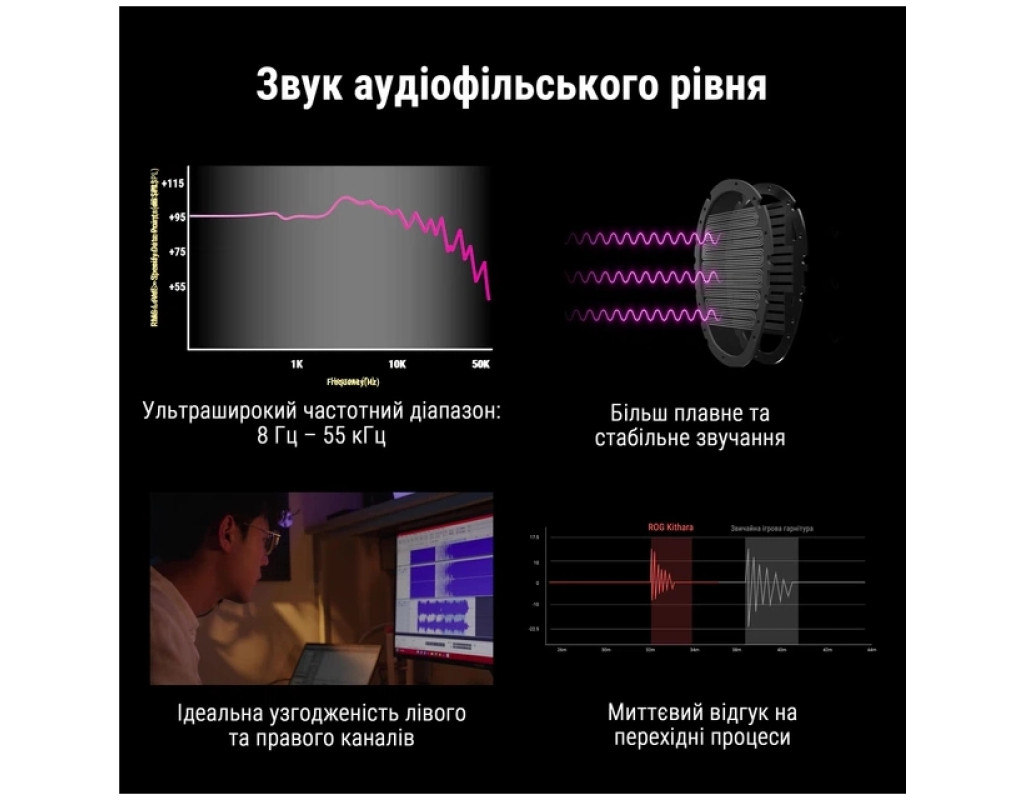 ROG Kithara Переосмыслить, чтобы выйти за рамки Наушники ROG Kithara созданы для геймеров, которые требуют по-настоящему высококачественного звука аудиофильского уровня, обеспечиваемого передовыми акустическими технологиями HIFIMAN. Открытая конструкция и специально разработанные ROG 100-мм планарно-магнитные драйверы HIFIMAN обеспечивают реалистичное звучание с четкими и точными деталями. Разработанные для соревновательных игр, Kithara оснащены встроенным полнодиапазонным MEMS-микрофоном для четкой внутриигровой связи. Сбалансированный кабель для наушников со сменными штекерами, а также адаптер USB-C гарантируют бескомпромиссную точность звука и широкую совместимость с различными устройствами. Powered By HIFIMAN Компания ROG объединила усилия с HIFIMAN, лидером в области планарно-магнитных наушников, чтобы обеспечить звук аудиофильского качества для тактических преимуществ в играх. Сочетая непревзойденный опыт ROG в соревновательных играх и передовые технологии драйверов HIFIMAN, наушники Kithara обеспечивают высокоточный, кристально чистый звук, настроенный на удовлетворение самых высоких требований игрового процесса. ROG-Tuned 100-мм планарно-магнитные драйверы HIFIMAN Разработанные совместно с экспертами по акустике HIFIMAN и ROG, а также опытными геймерами, и усовершенствованные в ходе обширных тестов на слух, динамики, используемые в Kithara, настроены на сбалансированное звучание. Благодаря передовой технологии магнитной диафрагмы, Kithara обеспечивает четкие, детализированные средние и высокие частоты, а также усиленные басы от HIFIMAN, гарантируя, что каждый нюанс на поле боя будет услышан с ясностью и точностью. Архитектура с открытой задней стенкой, выполненная с особой тщательностью. В соревновательных играх крайне важна пространственная ориентация. Инженеры-звукорежиссеры ROG провели детальные акустические исследования, протестировав наклонные текстуры, внутреннюю структуру и соотношение вентиляции в процессе разработки Kithara. В результате получилась конструкция с открытыми чашками наушников, обеспечивающая точную пространственную ориентацию благодаря балансу формы и функциональности. Обычные закрытые наушники Более узкая звуковая сцена Различные источники звука, как правило, располагаются ближе друг к другу, что затрудняет точное определение их местоположения. Открытая задняя панель ROG Kithara Более широкая звуковая сцена Более точный позиционный звук, превосходное качество изображения и захватывающий игровой процесс. Сверхширокая звуковая сцена для точного позиционирования звука Открытая конструкция создает чрезвычайно просторную, объемную звуковую сцену по сравнению с закрытыми гарнитурами. Конструкция улучшает разделение басов, средних и высоких частот, предотвращая заглушение важных звуков низкими частотами – таким образом, вы можете четко различать шаги и взрывы и быстрее реагировать на каждое движение в игре. Полнодиапазонный MEMS-микрофон на штанге В отличие от традиционных аудиофильских наушников, в которых отсутствует микрофон, Kithara оснащена встроенным полнодиапазонным MEMS-микрофоном на штанге, обеспечивающим кристально чистую передачу голоса для бесперебойной командной связи даже в самых напряженных сражениях. По сравнению со стандартными ECM-микрофонами, используемыми в большинстве игровых гарнитур, технология MEMS обеспечивает с