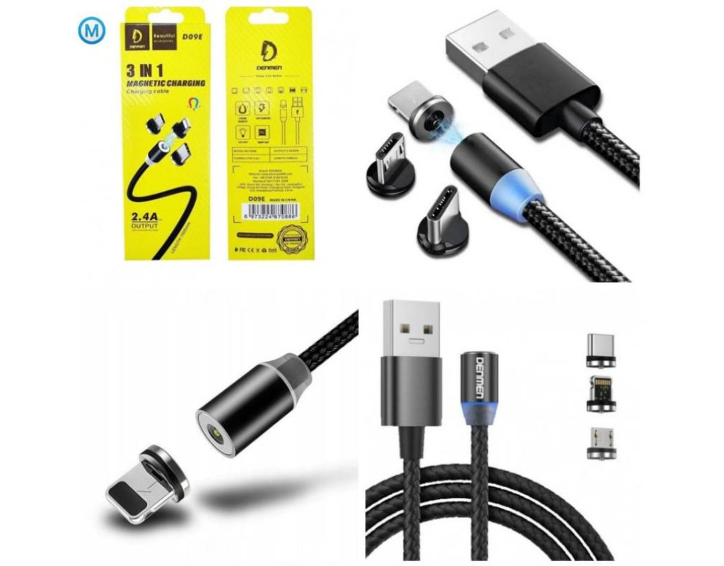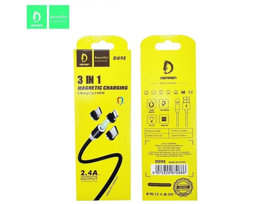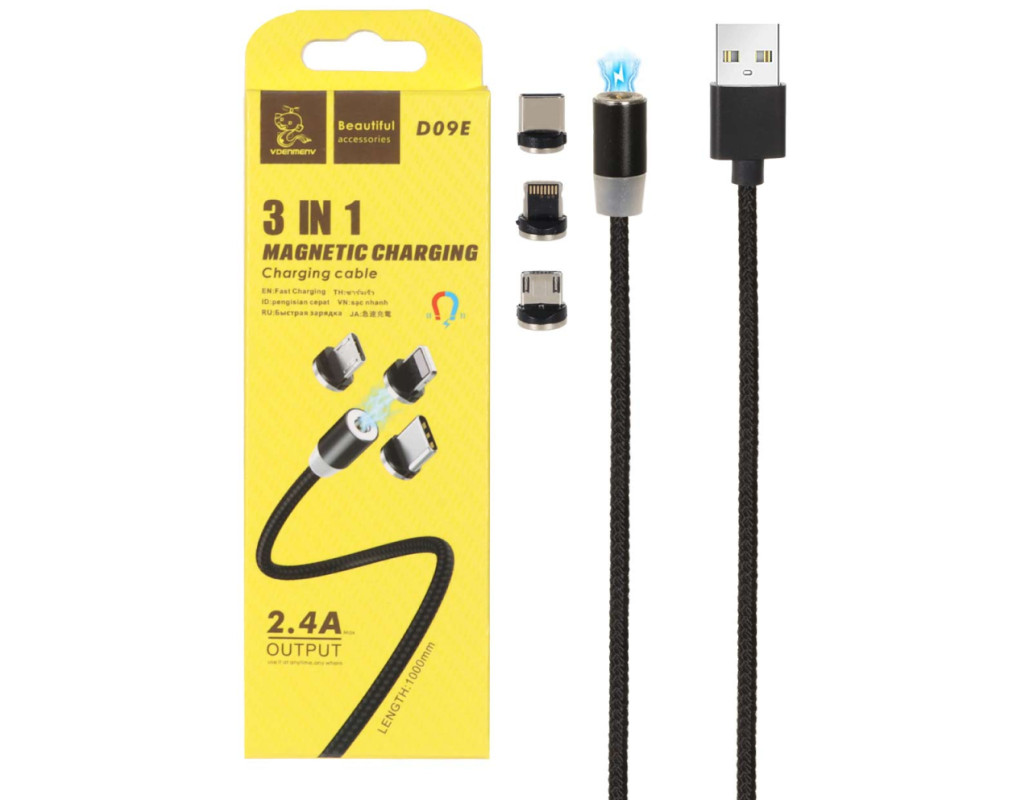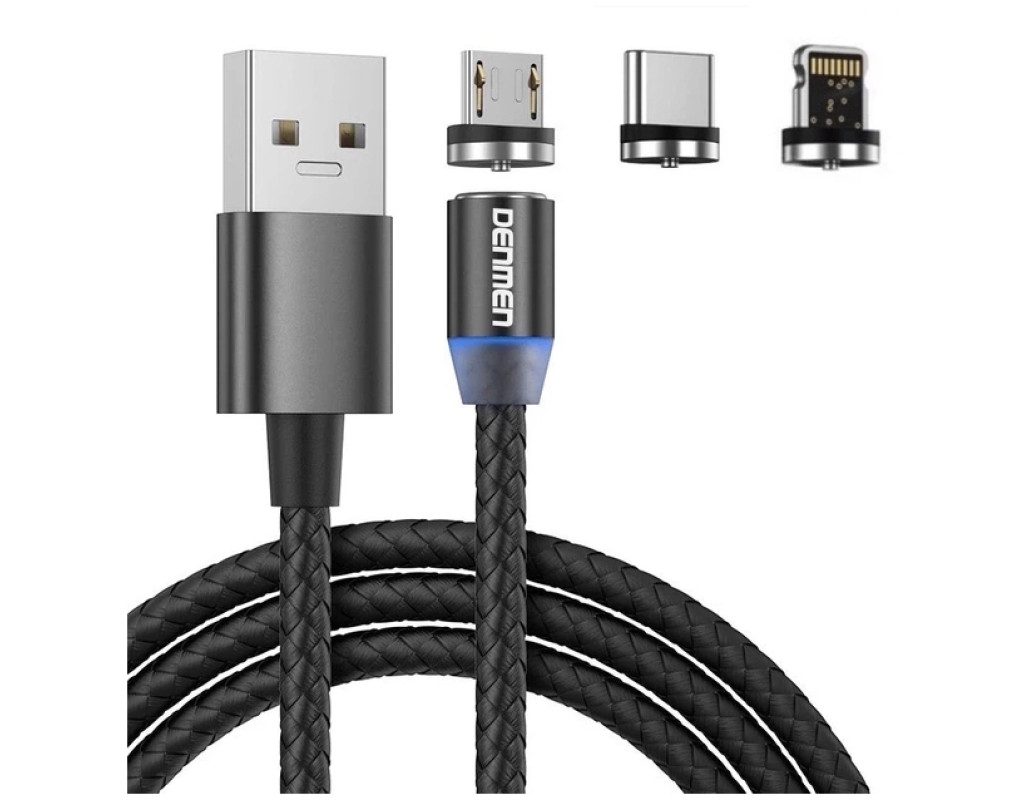 | Кабель магнітний Denmen D09E 3 в 1 Lightning, Type-C, Micro-USB — універсальний магнітний кабель 3 в 1, який підійде для зарядки більості сучасних пристроїв. Основні характеристики: Довжина кабелю: приблизно 1 м, що зручно для зарядки від настінного адаптера чи ноутбука. Максимальний струм: до 2,4 A — забезпечує стандартну швидкість зарядки. Магнітне кріплення: конектори легко приєднуються/від’єднуються магнітно, що зменшує знос роз’ємів та робить підключення швидким і зручним. Матеріал: кабель має тканинну (нейлонову) оплітку, яка підвищує гнучкість і зносостійкість. Колір: чорний. Призначення: заряджання смартфонів, планшетів та інших мобільних пристроїв (може підтримувати передачу даних, але основна функція — зарядка). Переваги: Один кабель замінює три різні (під різні роз’єми). Магнітне з’єднання зменшує ризик механічного пошкодження портів. Нейлонова оплітка робить кабель більш міцним і менш схильним до скручування. |