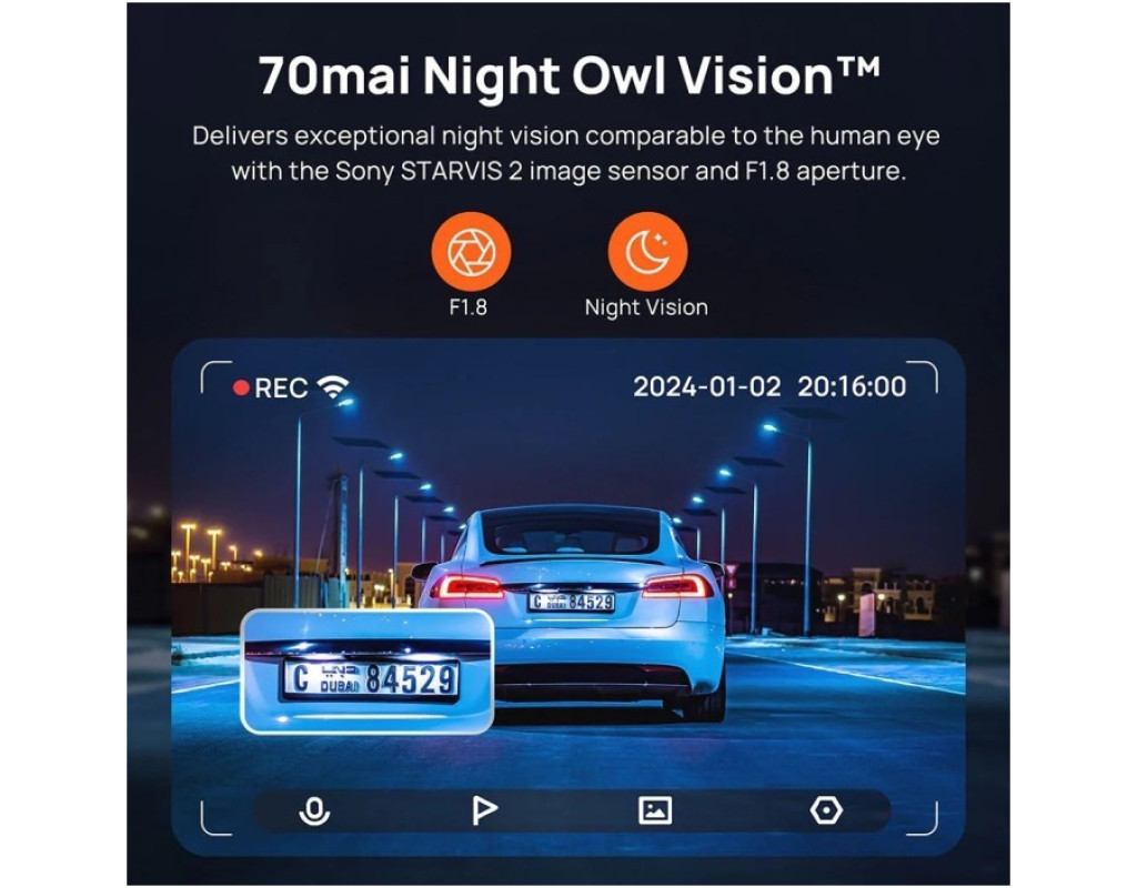 Настоящее качество изображения 4K Благодаря усовершенствованному 8-мегапиксельному сенсору 4K UHD, A810 захватывает в четыре раза больше пикселей, чем разрешение Full HD. Подключение 4G LTE Поддерживайте постоянную связь со своим автомобилем из любого места. Получайте мгновенные уведомления на свой мобильный телефон и отслеживайте маршруты в режиме реального времени, чтобы быть в курсе местоположения и безопасности вашего автомобиля. 70mai Видение Ночной Совы Эксклюзивная технология, которая создает ночное изображение с более высокой четкостью, меньшим шумом, сбалансированной экспозицией и лучшим контролем бликов. Выявление движения с искусственным интеллектом Алгоритм обнаружения движения на основе искусственного интеллекта рассчитывает расстояние и намерения людей поблизости. Активируйте запись, когда выявляется потенциальная угроза, предоставляя веские доказательства чрезвычайных ситуаций, вызванных людьми. Двухканальный HDR Фронтальная камера с разрешением 4K HDR и задняя камера с разрешением 1080P HDR обеспечивают максимальное покрытие дороги, обеспечивая превосходную четкость изображения, улучшенную точность цветопередачи и значительно улучшенный баланс уровней экспозиции. Вялотекущая съемка Режим парковки сжимает 15 минут до 1, чтобы сэкономить место на карте памяти. Поддерживается одновременная запись с передней и задней камер*. Мгновенно фиксируйте важные события |