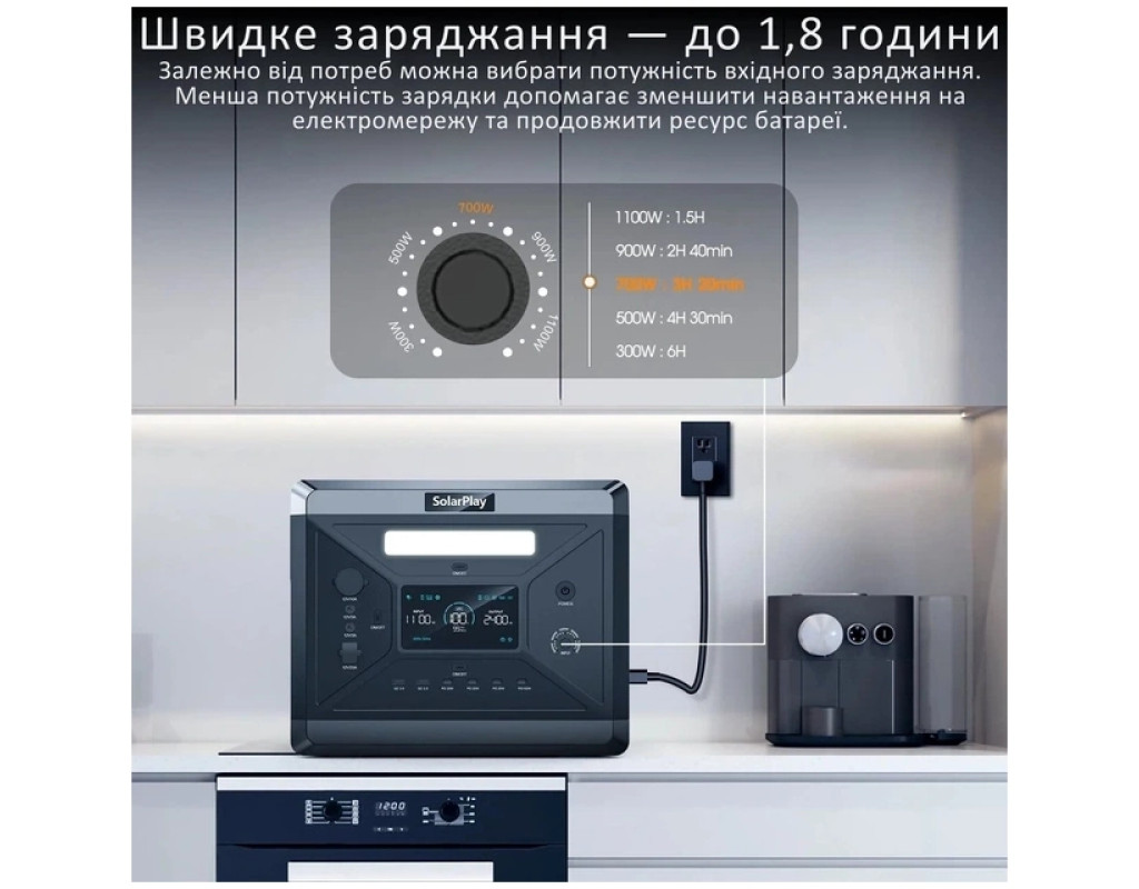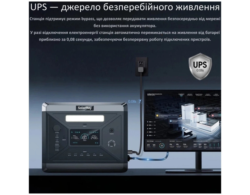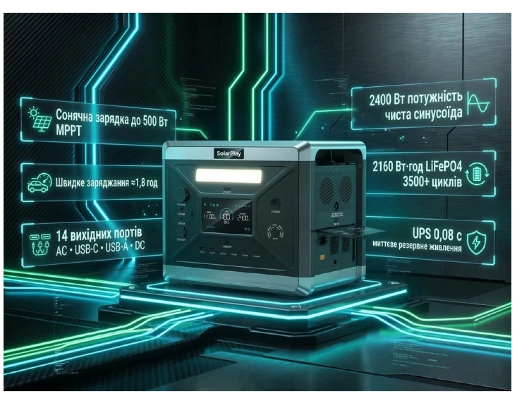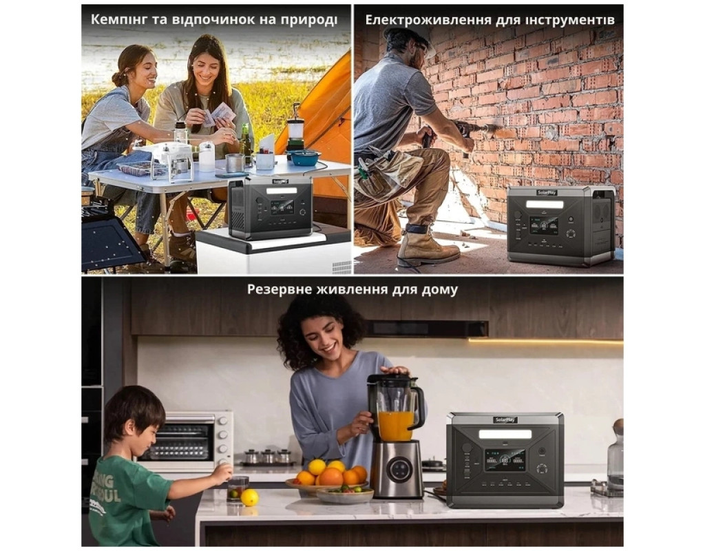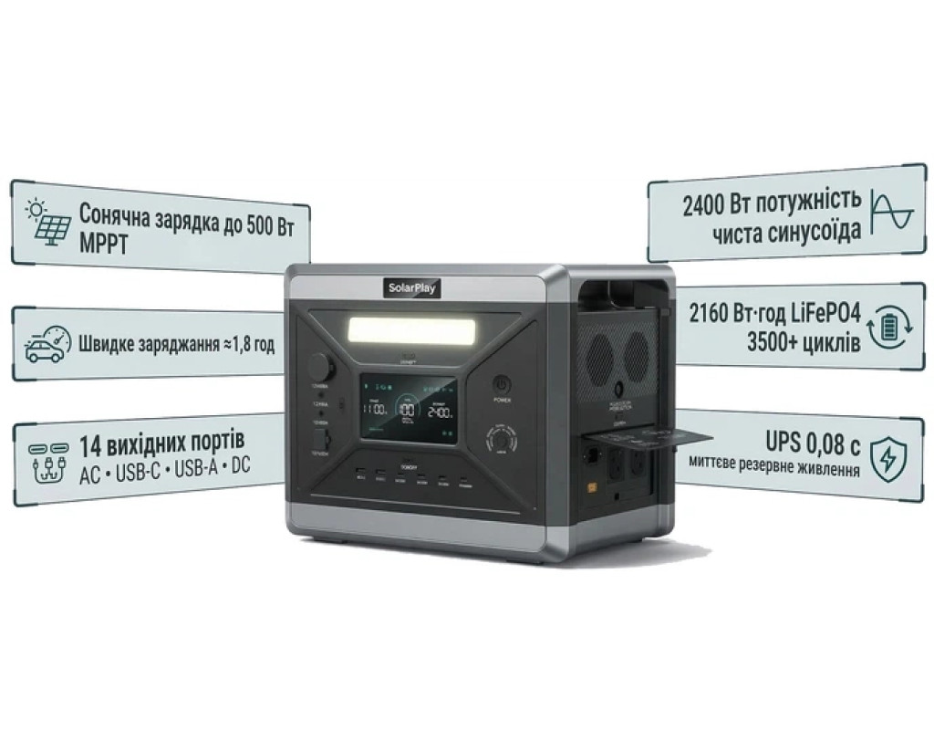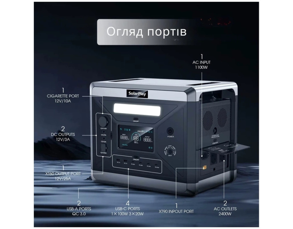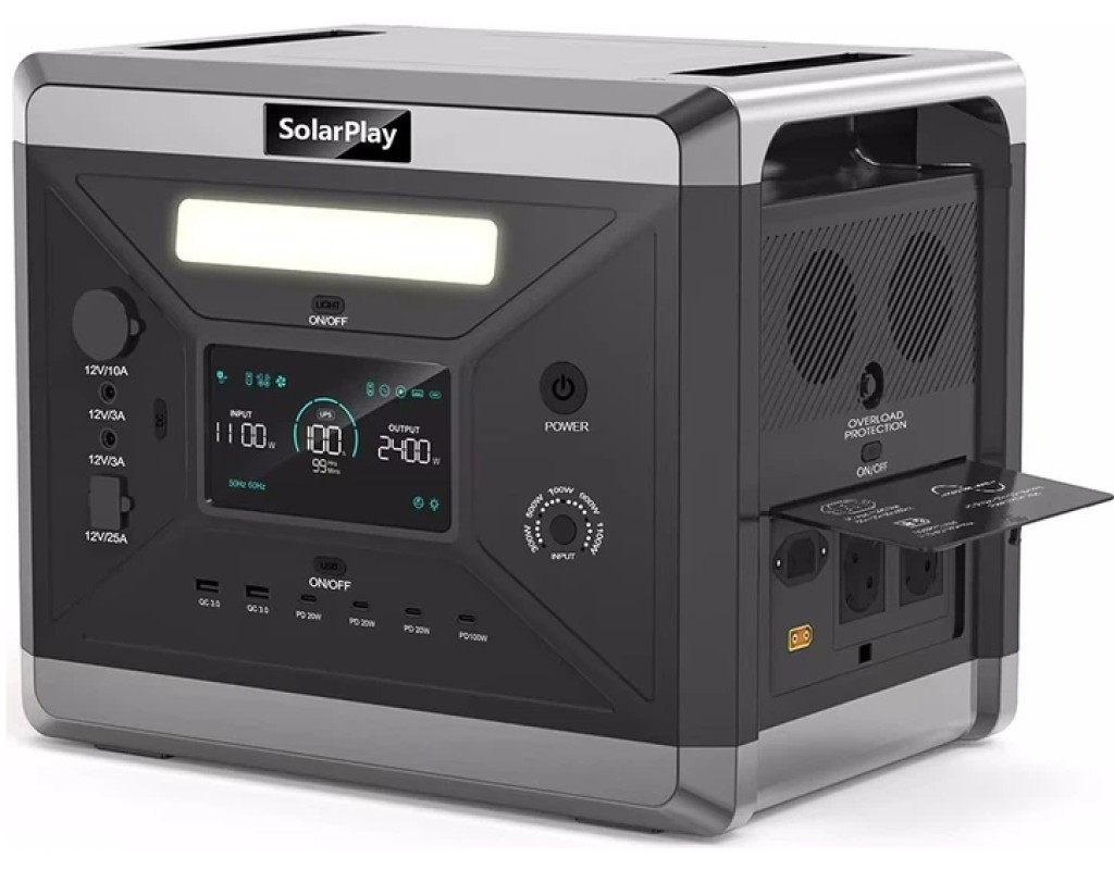 Портативная зарядная станция SolarPlay BCQ2501 (2400W/2160Wh) с LiFePO4-батареей – это мощный автономный источник питания, который подходит для резервного электроснабжения дома, использования в путешествиях, кемпинге или при работе с электроинструментом. Станция оснащена современным LiFePO₄ аккумулятором, обеспечивающим более 3500 циклов зарядки и ориентировочным сроком службы до 15 лет. Благодаря высокой емкости 2160Wh устройство может обеспечивать питание для разнообразной техники — от ноутбуков и освещения до холодильников или кухонных приборов. SolarPlay BCQ2501 поддерживает номинальную выходную мощность 2400 Вт с чистой синусоидой, что позволяет безопасно питать чувствительную электронику и бытовую технику. Пиковая мощность до 4000–4800 Вт в зависимости от нагрузки, позволяющая запускать устройства с высоким пусковым током. Станция поддерживает подзарядку от сети 220 В, солнечных панелей, автомобиля 12/24 В и генератора. Встроенный контроллер MPPT позволяет заряжать станцию от солнечных панелей с напряжением 11,5–48 В и мощностью до 500 Вт, что делает удобной для автономных систем энергопитания. Благодаря регулируемой входной мощности зарядки от сети (300/500/700/900/1100 Вт) можно адаптировать процесс зарядки к возможностям электросети или генератора. При максимальном значении 1100 Вт полный заряд занимает примерно 1,8 часа, а при комбинированном заряжании AC + солнечная энергия – около 1,5 часа. Функция UPS (источник бесперебойного питания) обеспечивает автоматическое переключение питания от батареи примерно за 0,08 секунды, что позволяет использовать станцию для компьютеров, сетевого оборудования, роутеров или другой техники. Для подключения устройств станция оснащена 14 выходными портами: AC-розетками, USB-A, USB-C, автомобильным прикуривателем и DC-выходами, что позволяет одновременно питать различные устройства — от смартфонов и ноутбуков до мощного электроинструмента. Система защиты BMS и MCU контролирует работу аккумулятора и обеспечивает защиту от перегрузки, короткого замыкания, перегрева, перенапряжения и глубоких разрядов. |