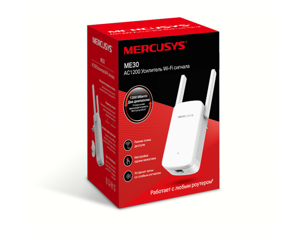 Усилитель Wi-Fi сигнала Mercusys ME30 с регулируемыми антеннами и высоким коэффициентом усиления позволит без труда увеличить покрытие Wi-Fi роутера и избавиться от зон со слабым Wi-Fi сигналом. Подключайтесь к Wi-Fi на высокой скорости из любой комнаты! Всегда максимальная скорость Wi-Fi класса AC1200 Скорость расширенной Wi-Fi сети до 1200 Мбит/с (до 300 Мбит/с на 2,4 ГГц, до 867 Мбит/с на 5 ГГц) идеально подойдёт для 4К?стримов и онлайн-игр. Адаптивная маршрутизация Технология адаптивной маршрутизации динамически выбирает наилучший канал и диапазон для передачи данных, обеспечивая скоростной Wi-Fi в любой точке дома. Умный индикатор сигнала Многоцветный индикатор позволит найти наиболее подходящее место для размещения усилителя Wi-Fi сигнала. Настройка одним нажатием Нажмите кнопку WPS на роутере и аналогичную кнопку на усилителе Wi-Fi сигнала, чтобы расширить покрытие за пару секунд. Шаг 1: нажмите кнопку WPS на роутере и на ME30. Шаг 2: разместите ME30 в подходящем месте, руководствуясь умным индикатором сигнала. Встроенный режим точки доступа ME30 — это больше, чем просто усилитель Wi-Fi сигнала. Подключите интернет к ME30 по кабелю Ethernet, чтобы превратить ME30 в двухдиапазонную Wi-Fi точку доступа. |