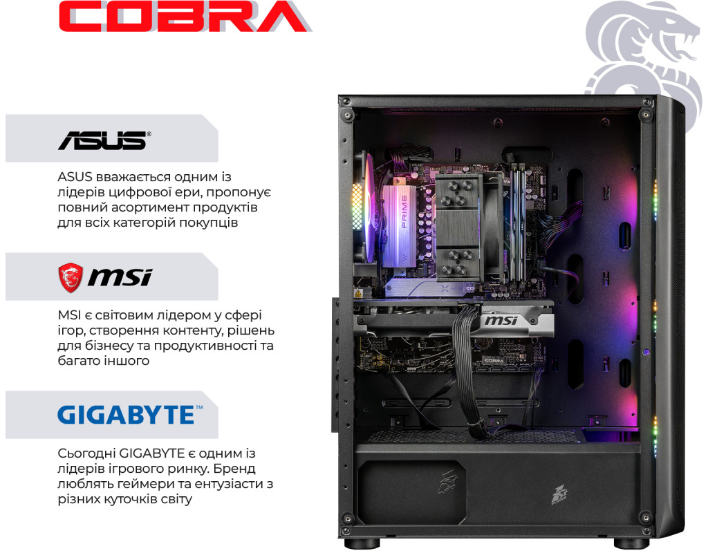 ПК COBRA собираются на базе комплектующих признанных мировых лидеров, таких как Intel, AMD, MSI, ASUS, Zalman, ProLogix, Seagate, Toshiba, Hitachi, Transcend, Kingston и др.