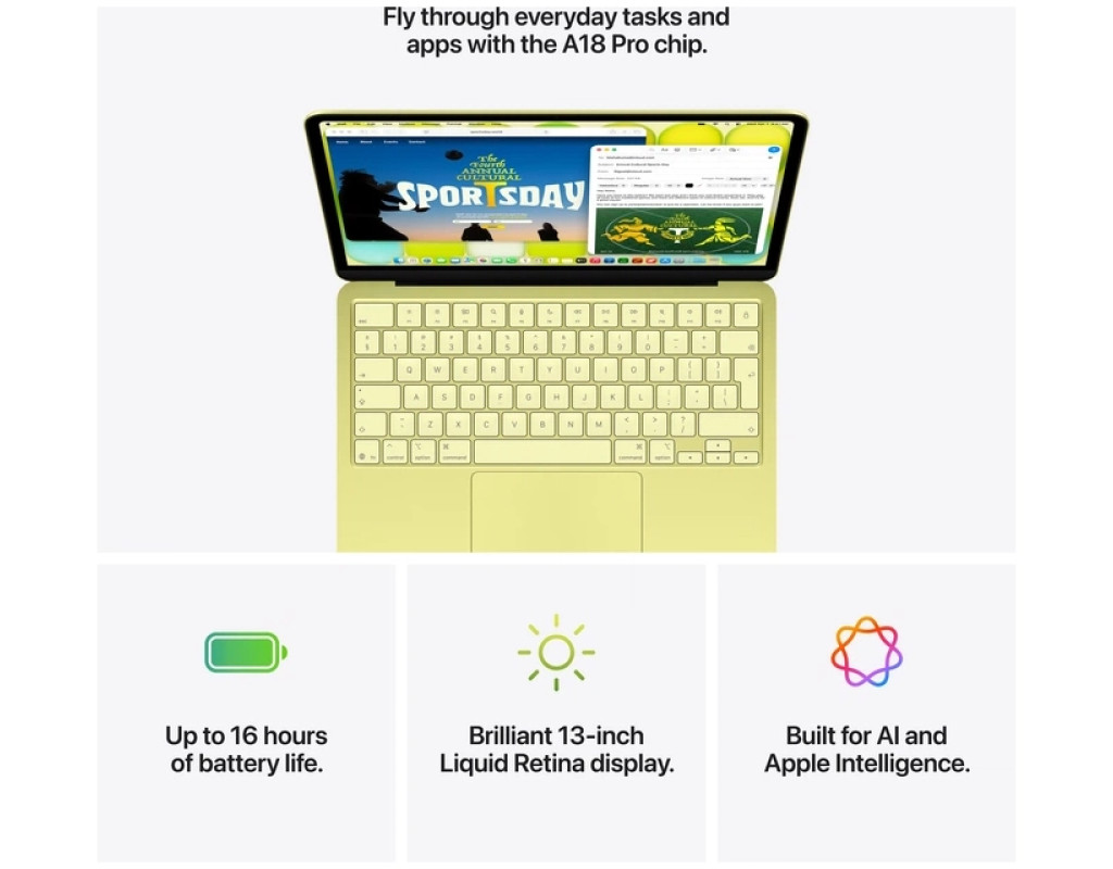 Мощность для ваших идей Чип A18 Pro помогает легко запускать любимые приложения, быстро справляться с повседневными задачами, раскрывать творческий потенциал и играть в динамичные игры. Что бы ни принес ваш день, вы сможете работать со скоростью вдохновения. Ежедневная продуктивность Отвечайте на электронные письма, участвуйте в видеозвонках, просматривайте веб-страницы, обновляйте расписание дел и делитесь фотографиями — с MacBook Neo легко справляться со всеми задачами. Учёба без ограничений MacBook Neo отлично подходит для обучения: от подготовки к экзаменам до использования Apple Intelligence для краткого пересказа конспектов или создания презентаций. Когда работа приносит удовольствие Создание таблиц, управление финансами и выполнение рабочих задач становятся проще и приятнее вместе с MacBook Neo. Развлечения нового уровня Благодаря мощной графике и яркому дисплею Liquid Retina фильмы, сериалы, видео и игры выглядят невероятно детализированными и насыщенными. Ваш постоянный спутник MacBook Neo всегда готов сопровождать вас — от ранних занятий до поздних вечеров за просмотром любимого контента. Дисплей, камера и звук Фотографии и видео выглядят ярко благодаря высокой контрастности и чёткой детализации. Текст остаётся чётким и удобным для чтения, а двойные боковые динамики создают объёмное звучание. От задач к результату Популярные AI-инструменты и приложения, такие как ChatGPT и Canva, отлично работают на MacBook Neo. Устройство обеспечивает плавный и универсальный опыт работы с искусственным интеллектом, открывая новые возможности для работы и творчества. Создан для Apple Intelligence Apple Intelligence — это персональная система искусственного интеллекта, которая помогает писать, выражать мысли и эффективно выполнять задачи. Она полностью интегрирована в MacBook Neo. |