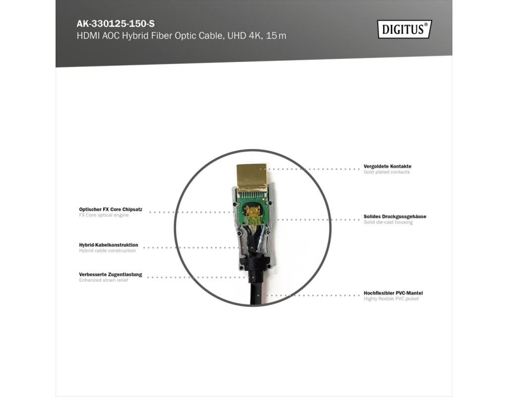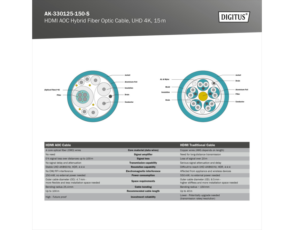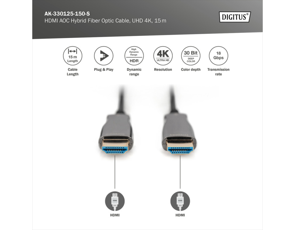 | Кабель DIGITUS HDMI UHD 4K AOC hybrid-fiber предназначен для передачи аудио и видео на большие расстояния без потери качества. Активная гибридная конструкция на основе оптоволокна и меди снижает влияние электромагнитных помех. Формат HDMI Type A M/M совместим с современными источниками сигнала и дисплеями. Кабель рассчитан на работу с UHD 4K при 60 Гц. |