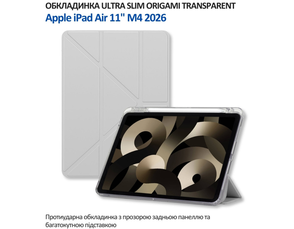 | "Обкладинка Ultra Slim Origami Transparent - це стильний і функціональний аксесуар для вашого планшета. Виготовлений з високоякісних матеріалів, він забезпечує надійний захист пристрою від подряпин, пилу та інших пошкоджень. Ця обкладинка має сучасний дизайн, який підходить для будь-якого стилю іміджу. Її тонкий профіль забезпечує легку транспортування планшета, не збільшуючи його розмірів. Ще однією функціональною особливістю цієї обкладинки є технологія Origami, яка дозволяє розгорнути обкладинку в різні позиції для зручного перегляду відео, читання або роботи з планшетом. Це особливо зручно під час подорожей, коли вам потрібно переглядати відео або працювати зі своїм планшетом в різних позиціях. Крім того, дана обкладинка оснащена прозорою задньою кришкою, яка дозволяє показати оригінальний дизайн вашого планшета. Обкладинка Ultra Slim Origami Transparent доступна в різних кольорах, що дозволяє вам вибрати той, який найкраще підходить вашому стилю. Вона також має точні вирізи для камери, роз'ємів та кнопок, щоб ви могли легко користуватися своїм планшетом, не знімаючи обкладинку." |