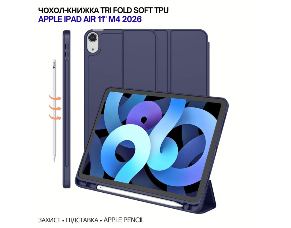 | "Чохол-книжка Tri-Fold Soft TPU BeCover з тримачем для Apple Pencil для Apple iPad Air 11" M4 (2026) Практичний і стильний чохол, що поєднує надійний захист, функціональність і комфорт у щоденному використанні. Конструкція Tri-Fold дозволяє легко трансформувати чохол у підставку, а м’який TPU-матеріал забезпечує захист від ударів і подряпин. ✅ Надійний захист М’який та гнучкий TPU ефективно поглинає удари та захищає планшет від подряпин, потертостей і випадкових падінь. Чохол щільно прилягає до корпусу без люфтів. ⭐ Функція підставки (Tri-Fold) Складна конструкція дозволяє використовувати планшет у різних положеннях: для перегляду відео для роботи або набору тексту ⚡ Автоматичний Sleep / Wake Розумна функція автоматично вмикає екран при відкритті чохла та вимикає при закритті, економлячи заряд батареї. ✏️ Тримач для Apple Pencil Вбудований слот дозволяє зручно зберігати стилус і завжди тримати його під рукою. ⚙️ Зручність у деталях Точні вирізи забезпечують вільний доступ до всіх портів, кнопок і камери без необхідності знімати чохол. ✋ Тонкий і легкий Чохол не обтяжує планшет і зберігає його акуратний вигляд." |