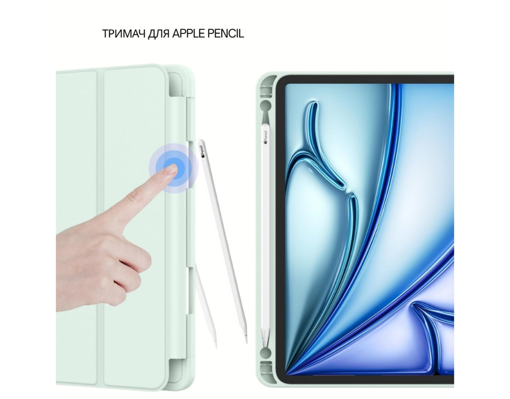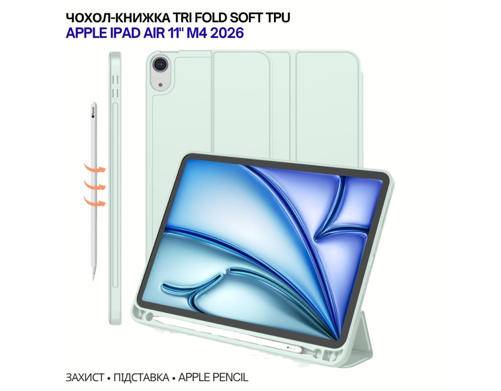 | "Чохол-книжка Tri-Fold Soft TPU BeCover з тримачем для Apple Pencil для Apple iPad Air 11" M4 (2026) Практичний і стильний чохол, що поєднує надійний захист, функціональність і комфорт у щоденному використанні. Конструкція Tri-Fold дозволяє легко трансформувати чохол у підставку, а м’який TPU-матеріал забезпечує захист від ударів і подряпин. ✅ Надійний захист М’який та гнучкий TPU ефективно поглинає удари та захищає планшет від подряпин, потертостей і випадкових падінь. Чохол щільно прилягає до корпусу без люфтів. ⭐ Функція підставки (Tri-Fold) Складна конструкція дозволяє використовувати планшет у різних положеннях: для перегляду відео для роботи або набору тексту ⚡ Автоматичний Sleep / Wake Розумна функція автоматично вмикає екран при відкритті чохла та вимикає при закритті, економлячи заряд батареї. ✏️ Тримач для Apple Pencil Вбудований слот дозволяє зручно зберігати стилус і завжди тримати його під рукою. ⚙️ Зручність у деталях Точні вирізи забезпечують вільний доступ до всіх портів, кнопок і камери без необхідності знімати чохол. ✋ Тонкий і легкий Чохол не обтяжує планшет і зберігає його акуратний вигляд." |