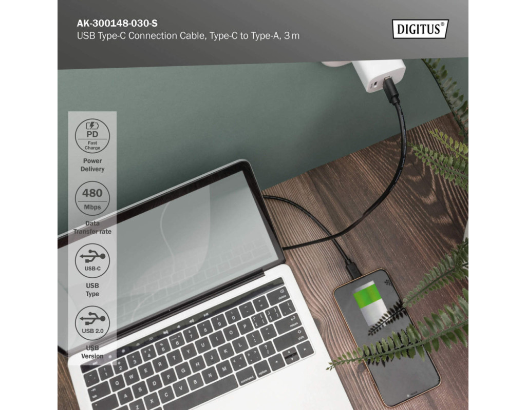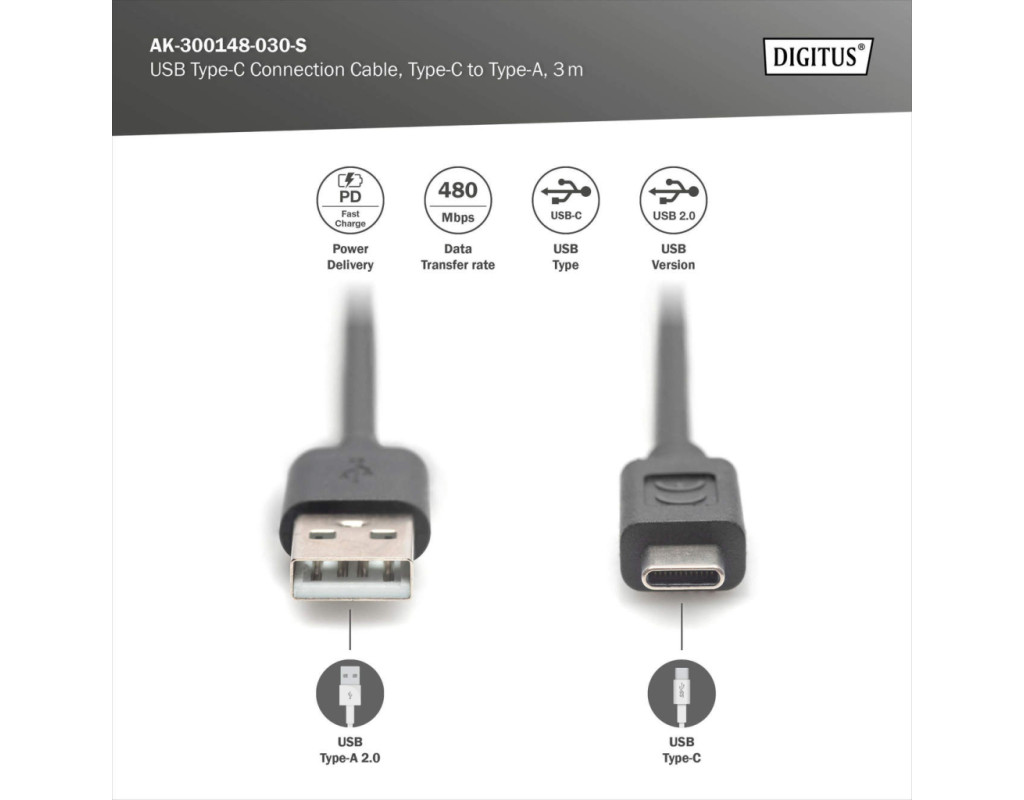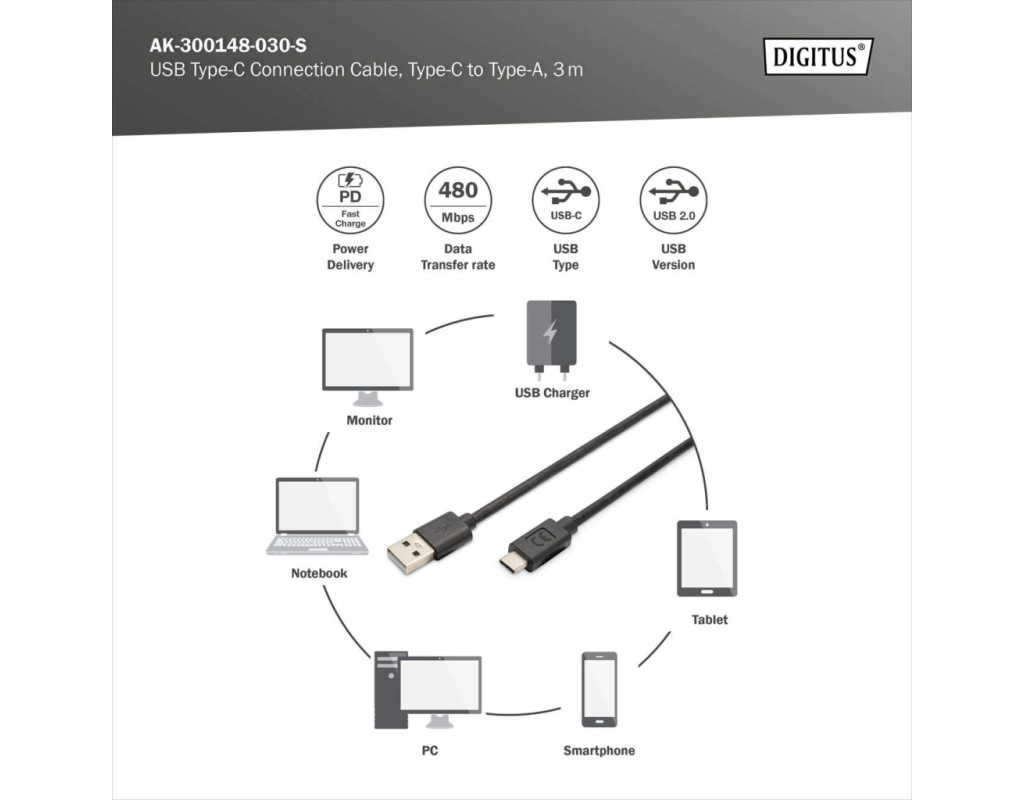| Кабель DIGITUS USB-A к USB-C предназначен для зарядки и синхронизации данных. Длина три метра позволяет свободно расположить устройство. Поддержка USB 2.0 обеспечивает скорость передачи до 480 Мбит/с. Реверсивный штекер Type-C упрощает подключение в любой ориентации. |