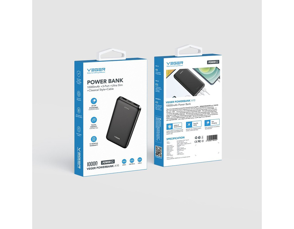 | VEGER W1065 – обеспечивает десятки подзарядок для смартфонов и планшетов благодаря аккумулятору 10000 мАч, а компактные порты USB-A и USB-C позволяют заряжать несколько устройств одновременно.
