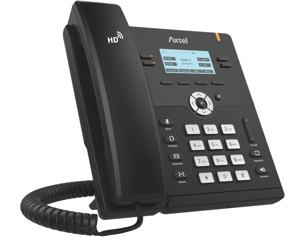 | Axtel AX-300G — это простой в использовании современный офисный телефон с 4 SIP-аккаунтами, 4 контекстными кнопками и 5-полосной конференц-связью.