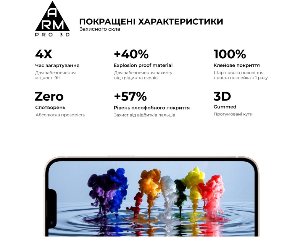 Защитное стекло Armorstandart Pro 3D Series - это совершенно новый уровень в защите дисплея смартфона. В производстве используется материал Japenese Asashi Glass, который проходит закалку в течение 4-х часов. Это обеспечивает идеальную прозрачность защитного покрытия без искажений изображения, а также мощную защиту от трещин и царапин. Стекло никак не влияет на отзывчивость тачскрина. В нем содержится специальный материал, препятствующий появлению сколов. 3D Gummed - прорезиненные углы для дополнительной защиты при падении. Верхняя часть стекла содержит улучшенное олеофобное и гидрофобное покрытие. При использовании стекла это обеспечивает природные тактильные ощущения - пальцы легко скользят по поверхности. При этом изображение отображается с аутентичной яркостью и четкостью без искажений. Задняя часть по всей площади покрыта клеевой основой нового поколения. Благодаря этому достигается полное отсутствие пузырей и возможность переклейки стекла при первичной неровной установке. Защитное стекло Armorstandart Pro 3D Series имеет оптимальные габариты и толщину в 0.3 мм. В комплект входит все необходимое для быстрой и комфортной установки. Особенности: