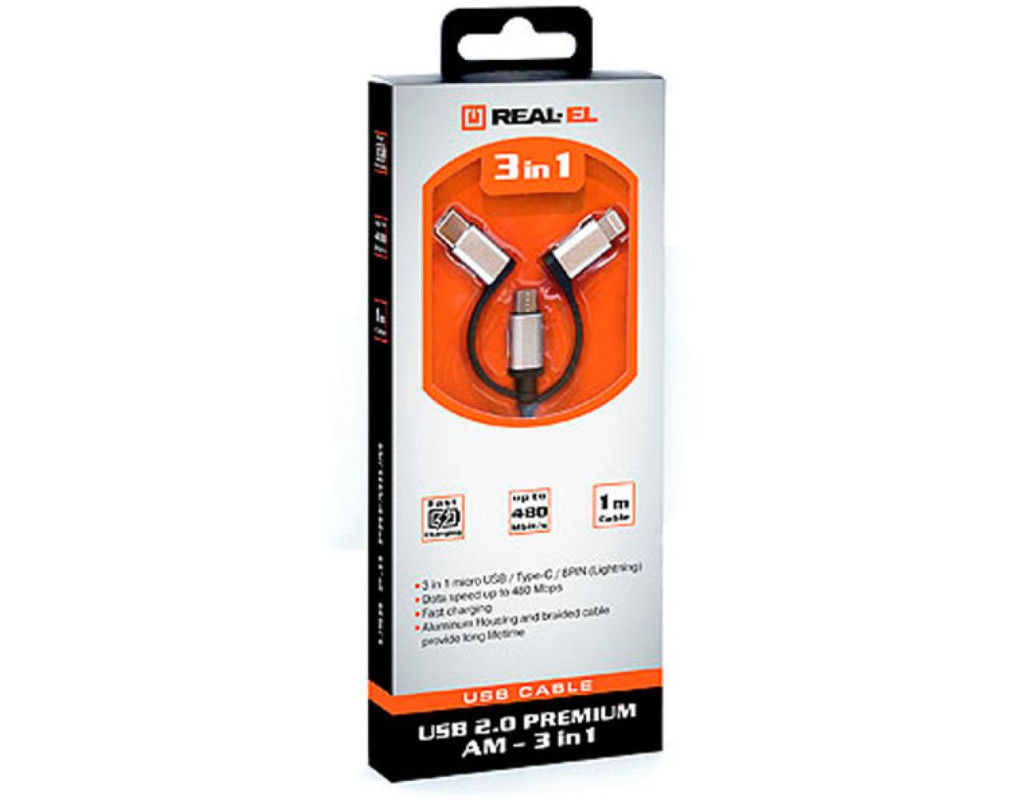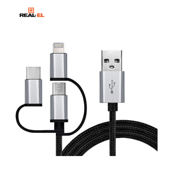 Дата кабель USB 2.0 AM to Lightning + Micro 5P + USB-C 1.0m black REAL-EL (EL123500035)
