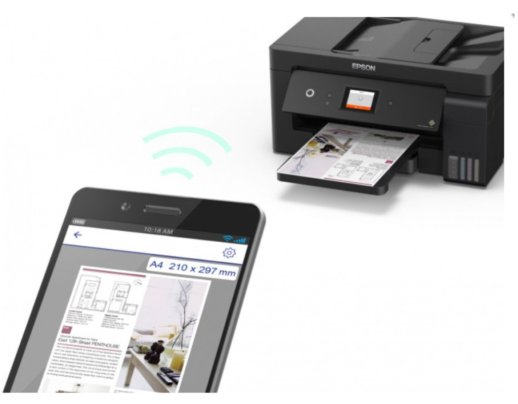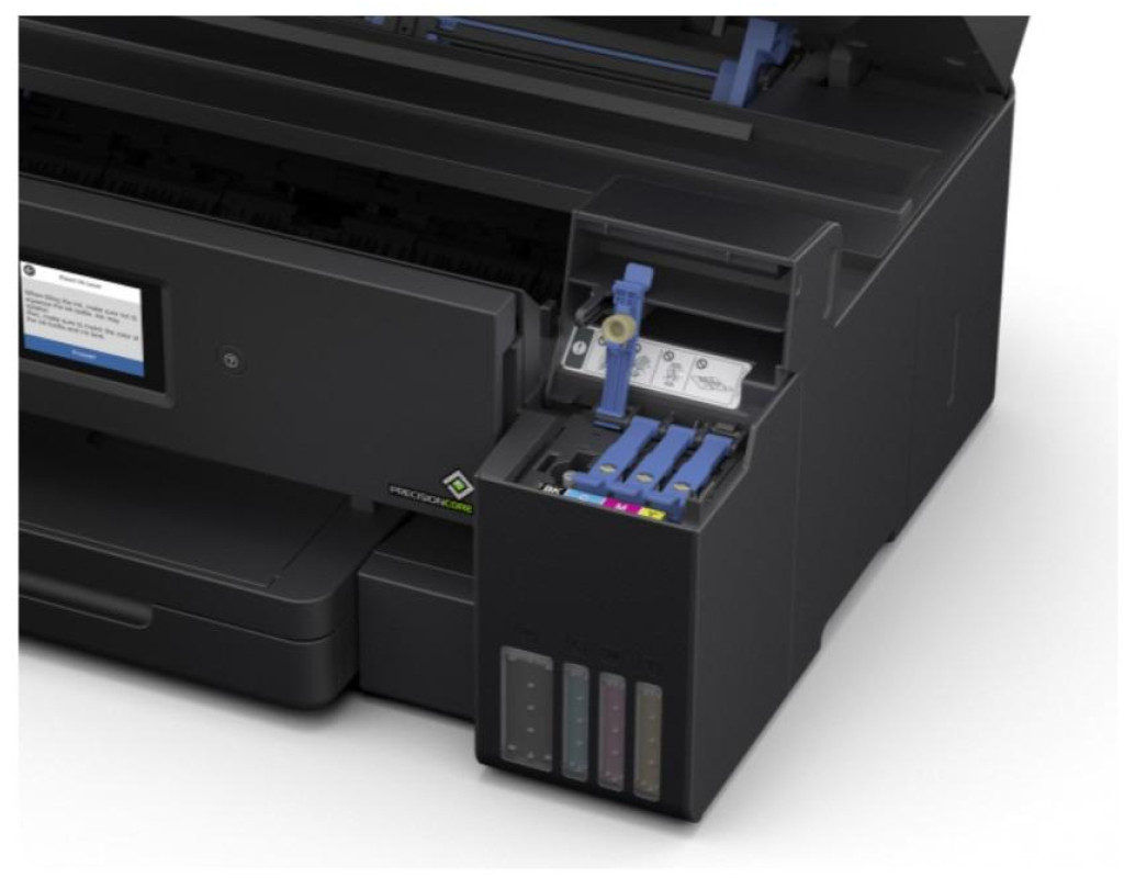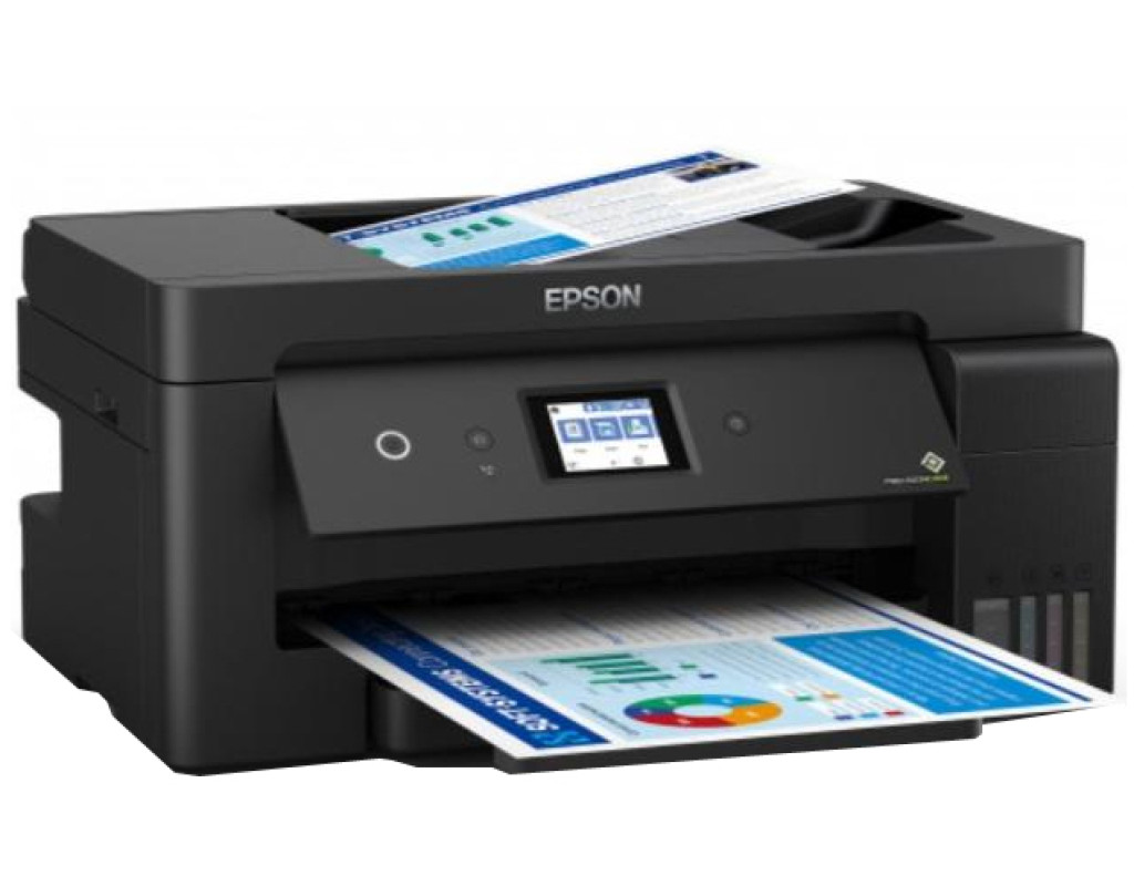 Бескартриджная система – большой ресурс печати Бескартриджные устройства Epson используют чернильные контейнеры вместо картриджей. Их объем в 10 раз превышает объем стандартных картриджей, благодаря чему всего с одного комплекта контейнеров можно распечатать до 7500 ч/б и 6000 цветных отпечатков. Инновационная система заправки чернил «Key Lock» Система «Key Lock» не даст перепутать цвета при заправке. Секрет новой системы заправки в уникальной форме носика контейнера, которая совместима только с соответствующим по цвету заправочным отверстием по принципу ключа с замком. Новые контейнеры со встроенным клапаном от проливания Контейнеры с чернилами для моделей серии L имеют внутренний клапан, который защищает от случайного проливания при переворачивании контейнера. Клапан открывается только при установке контейнера в отверстие для заправки, после чего чернила начинают поступать внутрь печатающей системы. Как только вы вынимаете контейнер из заправочного отверстия - клапан блокирует подачу чернил, исключая возможность случайного проливания. Четкий текст и графика как на лазерном принтере Для черно-белой печати модель использует пигментные чернила Epson черного цвета, которые обеспечивают: Четкий текст и графику на обычной бумаге; Мгновенное высыхание отпечатков; Стойкость к попаданию влаги и выделению маркером. Сменная емкость для отработанных чернил МФУ Epson L14150 – устройство для бизнеса, рассчитанное на достаточно высокие нагрузки печати. Для того чтобы не возить устройство в сервисный центр при заполнении емкости для отработанных чернил, мы сразу оснастили его сменной емкостью, которую пользователь может с легкостью заменить самостоятельно. Беспроводное подключение по Wi-Fi Основные преимущества беспроводной печати – экономия места на рабочем столе и печать из любой точки дома и офиса. Подключитесь к любому устройству с поддержкой Wi-Fi и используйте максимум возможностей беспроводной работы с принтером – печатайте и сканируйте документы и фотографии удаленно. Подключение по сети Ethernet Данное устройство дает возможность сетевого подключения, что делает его идеальным решением для работы с нескольких ПК в условиях офиса. Причём пользователи смогут не только отправлять задания на печать, но и сканировать изображения сразу на свой компьютер, что сэкономит их рабочее время и ускорит рабочий процесс. Печать с мобильных устройств Скачайте и установите одно из бесплатных приложений сервиса Epson Connect и печатайте или сканируйте изображения с ваших мобильных устройств, работающих на базе iOS и Android. Приложения сервиса также позволяют отправлять на печать документы и фотографии по электронной почте, указав присвоенный принтеру e-mail адрес (E-mail print). Лотки для разных типов бумаг Epson L14150 оснащен несколькими лотками для загрузки бумаги: фронтальный предназначен для А4 формата, задний лоток рассчитан на загрузку носителей вплоть до А3 формата, что позволяет одновременно работать с различными форматами и типами бумаг. Если вы печатали документы формата А4, а затем хотите напечатать А3, вам не придется вынимать бумагу и загружать вместо нее новую. Просто задайте тип и формат бумаги в драйвере устройства, и оно само определит лоток, подходящий для печати нужных вам материалов. Автоподатчик для сканирования документов (ADF) МФУ оборудовано планш