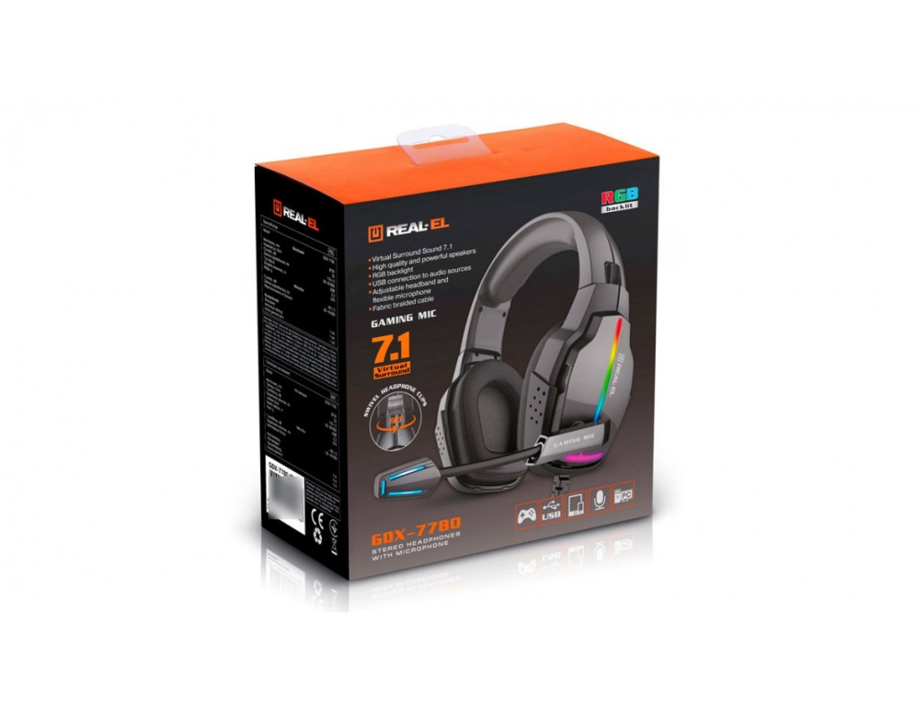 В комплектацию наушников входят: самые наушники с микрофоном, руководство пользователя и гарантийный талон. Особенности наушников включают в себя RGB подсветку, виртуальный объемный звук 7.1, возможность подключения, передачи звука и сигнала микрофона через USB, регулируемое оголовье и гибкий микрофон, пульт дистанционного управления на кабеле и тканевую оплетку кабеля для дополнительной прочности. Для подключения и использования наушников необходимо подключить USB-штекер наушников к разъему аудиовыхода источника сигнала (например, ПК или ноутбука), а затем настроить необходимый уровень громкости с помощью регулятора громкости. |