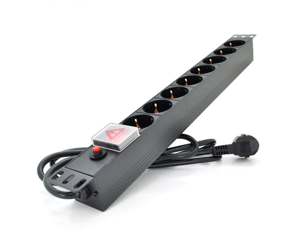 | Подовжувач PiPo на 8 розеток з вимикачем + відсікач, 220В, німецький тип, 1U 19", алюмінієвий корпус, чорний довжина кабелю 1,8 м, Q25 |