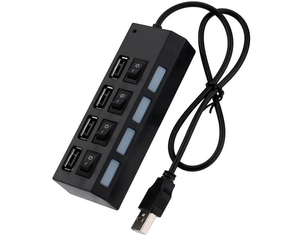 Компактный USB-концентратор с четырьмя портами и удобными переключателями для каждого из них. Позволяет легко подключать и отключать устройства без необходимости извлекать их из портов. Идеальное решение для расширения возможностей ноутбуков и ПК с ограниченным количеством USB-разъемов.